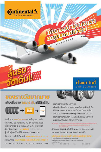 “คอนติเนนทอล” ยางรถยนต์ระดับพรีเมี่ยมด้วยนวัตกรรมคุณภาพจากเยอรมนี ขยายตลาดยางทั่วประเทศกระตุ้นผู้ใช้รถเลือกยางคุณภาพสูงเพื่อความปลอดภัยในการเดินทางหน้าฝน ส่งแคมเปญโปรโมชั่นพิเศษ “เก็บกระเป๋าลุ้นเหินฟ้า ตะลุยแดนปลาดิบกับคอนติเนนทอล” ชวนเจ้าของรถยนต์ทั่วไปและรถขับเคลื่อน 4 ล้อเปลี่ยนมาใช้ยางคอนติเนนทอลทุกรุ่น พร้อมกันทั้ง 4 เส้น รับสิทธิ์ส่งเอสเอ็มเอสเข้ามาร่วมชิงรางวัลพิเศษท่องเที่ยวกับคอนติเนนทอลได้ทันที โดยรางวัลมีตั้งแต่ แพ็คเกจทัวร์ญี่ปุ่นแบบพรีเมี่ยม ห้องพักที่ศาลา สมุย ห้องพักที่มาราเกซ หัวหิน จักรยาน และสร้อยคอทองคำ รวมมูลค่าทั้งหมดกว่า 6 แสนบาท ตั้งแต่วันนี้จนถึง 31 ตุลาคมนี้