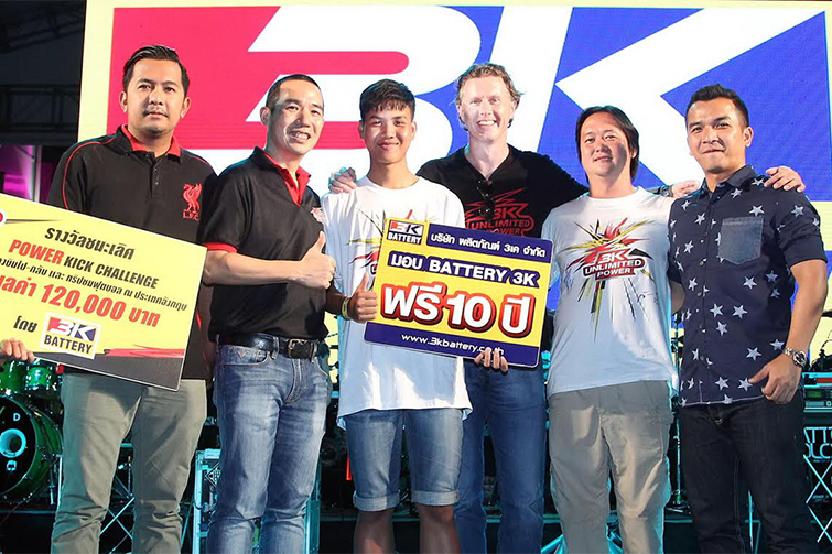 “แม็คก้า-สตีฟ แม็คมานามาน” ตำนาน "หงส์แดง" สุดฟิน! ดวลพลังเตะวัดความแม่น กับ 4 แชมป์พาวเวอร์คิกแข้งไทย พร้อมชม “เรซ ควีน” ไทยคนแรก สวยเก่ง ขึ้นแท่นนางฟ้าประดับวงการกีฬามอเตอร์สปอร์ต! บริษัท ผลิตภัณฑ์ 3เค จำกัด ผู้นำในการผลิตและจำหน่ายแบตเตอรี่รถยนต์ของเมืองไทย ภายใต้แบรนด์ 3เค แบตเตอรี่ ประกาศผลอย่างเป็นทางการแล้วสำหรับผู้ชนะการแข่งขันดวลพลังยิงฟรีคิก “3K POWER KICK CHALLENGE ” รายที่ 4 ประจำภาคกลาง ที่จะได้ร่วมทริปบินลัดฟ้าไปชมฟุตบอลที่ประเทศอังกฤษกับเพื่อนๆ ผู้ชนะจาก 3 ภาค หลังโชว์ฟอร์มยิงฟรีคิกได้แรงและแม่นที่สุด พร้อมสาวสวยผู้ชนะใจกรรมการได้รับตำแหน่ง “3K Power Race Queen Thailand Brand Ambassador”