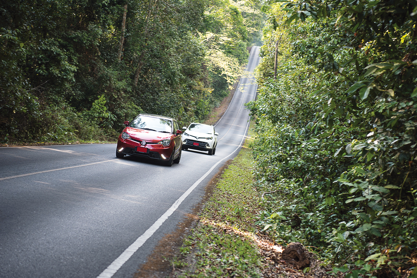 มาดูด้านขุมพลังกันบ้าง MG3 มาพร้อมเครื่องยนต์ขนาด 1.5 ลิตร DOHC VTi-TECH 4 สูบ 16 วาล์ว ประหยัดน้ำมันด้วยระบบวาล์ว แปรผันคู่ ให้กำลังสูงสุด 106 แรงม้า ที่ 6,000 รอบต่อนาที และแรงบิดสูงสุด 135 นิวตันเมตร ที่ 4,500 รอบต่อนาที ระบบเกียร์อัตโนมัติ 5 สปีด SeleMatic (เซเลเมติก) พร้อมระบบปรับโหมดการขับขี่ รองรับน้ำมันแก๊สโซฮอล์ E85 ความเร็วค่อย ๆ เพิ่มขึ้นอย่างรวดเร็ว ผมทดลองกับทางลาดชันก็ยังทำความเร็วได้ดี