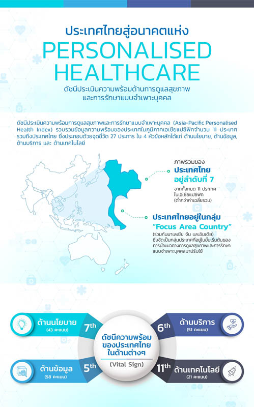 ข้อมูลจากดัชนีประเมินความพร้อมของการดูแลสุขภาพและการรักษาแบบจำเพาะบุคคล พบว่า ขณะนี้ประเทศไทยอยู่ในกลุ่ม “Focus Area Country” ร่วมกับมาเลเซีย จีน และอินเดีย ซึ่งเป็นกลุ่มประเทศที่อยู่ในขั้นเริ่มต้นของการนำแนวทางการดูแลสุขภาพและการรักษาแบบจำเพาะบุคคลมาปรับใช้ ทั้งนี้ดัชนีดังกล่าวใช้เกณฑ์พิจารณาความพร้อมออกเป็น 4 ด้านหลัก ได้แก่ (1) ด้านนโยบาย (2) ด้านข้อมูล (3) ด้านบริการ และ (4) ด้านเทคโนโลยี โดยภาพรวมประเทศไทยมีความพร้อมอยู่ในลำดับที่ 7 จากเมื่อเทียบประเทศต่างๆ ในภูมิภาคเอเชียแปซิฟิก 11 ประเทศ หากจำแนกตามความพร้อมในแต่ละด้านนั้น ประเทศไทยจะอยู่ลำดับที่ 7 ด้านนโยบาย, ที่ 5 ด้านข้อมูล, ที่ 6 ด้านบริการ และอยู่อันดับรั้งท้ายด้านเทคโนโลยี