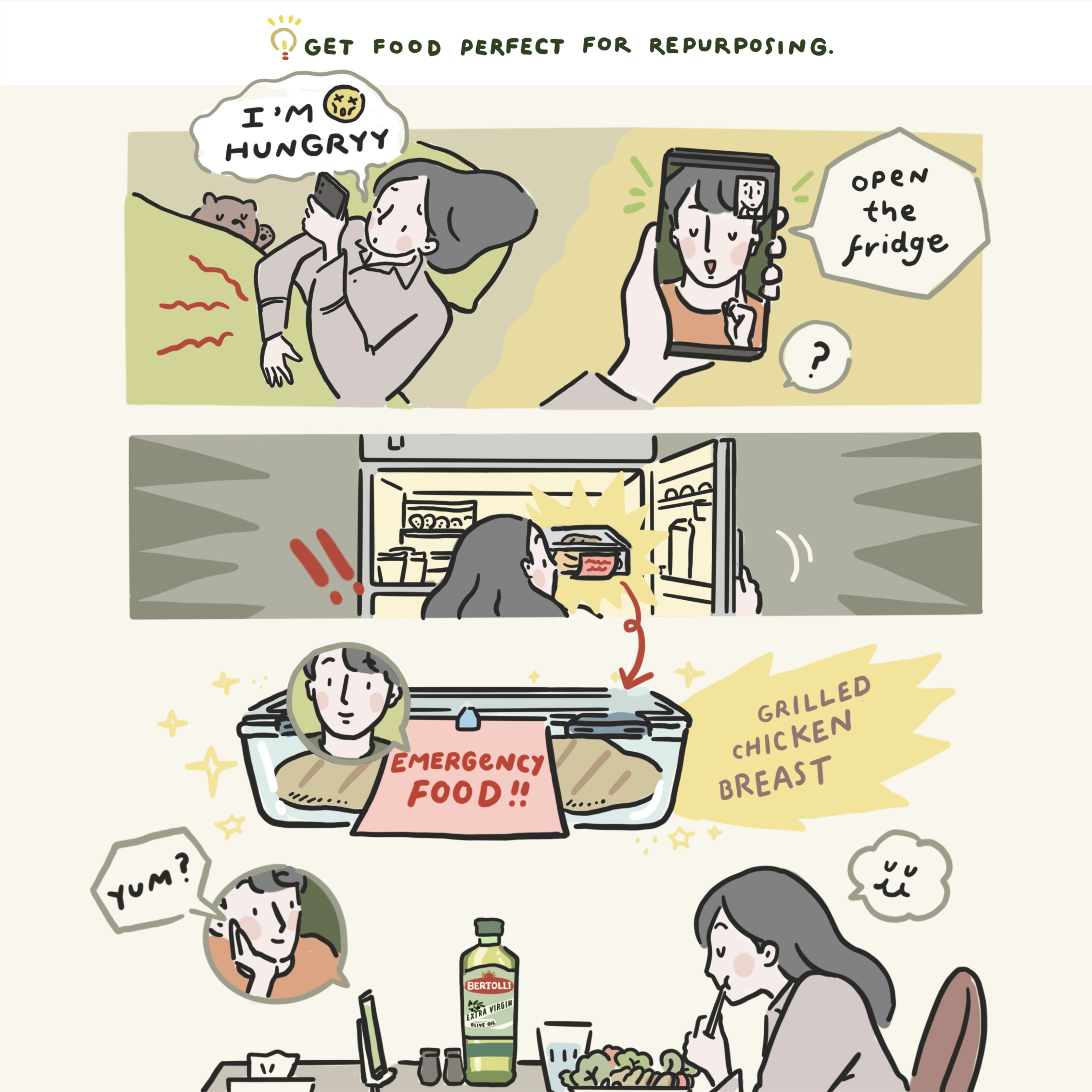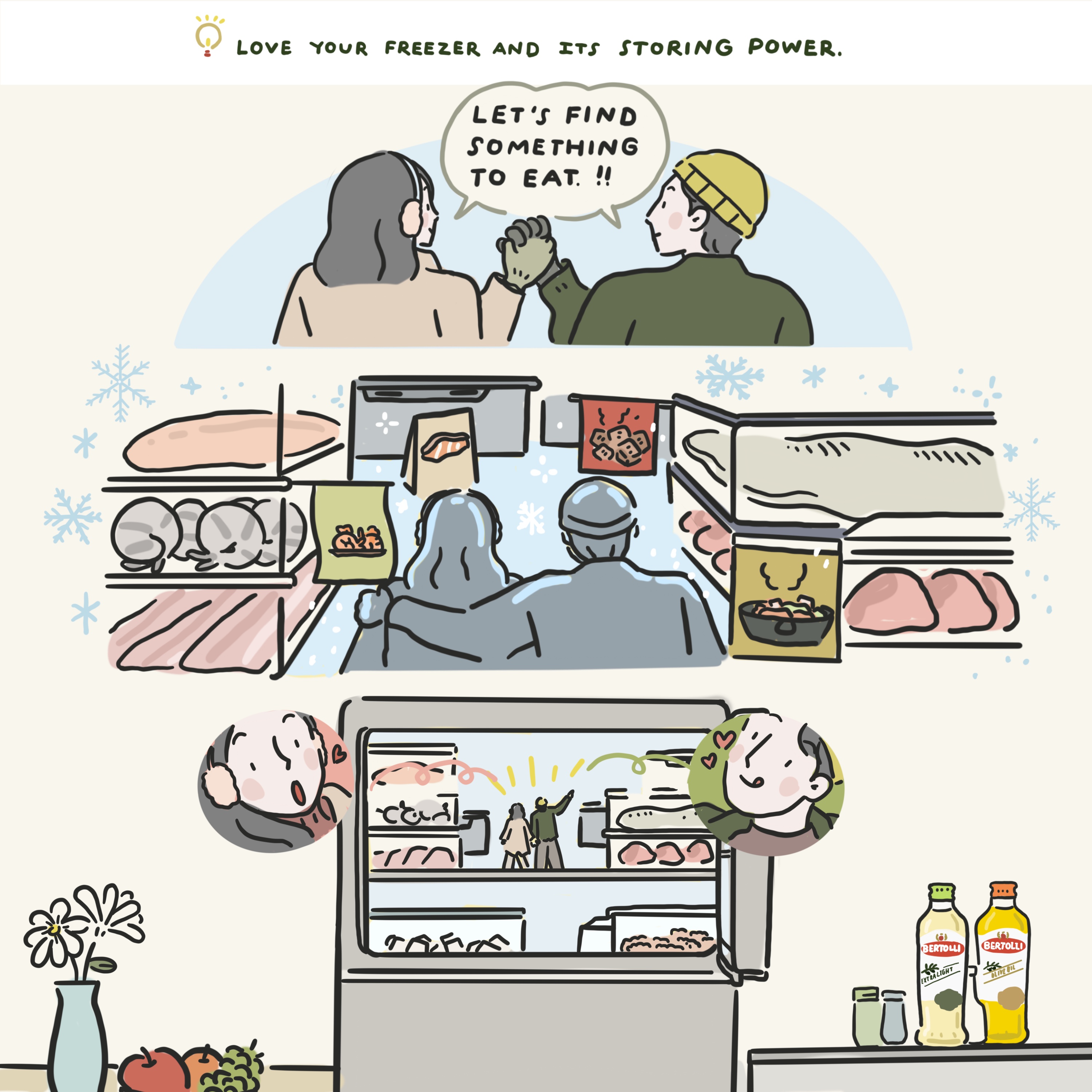 เบอร์ทอลลี่ได้ร่วมมือกับ Reenp นักวาดภาพประกอบไทยรุ่นใหม่ ที่มาช่วยรังสรรค์เนื้อหาที่เข้าใจง่าย ผ่านภาพประกอบทั้งหมด 8 ชุด ที่เล่าถึงวิถีชีวิตของผู้คนในปัจจุบัน ดำเนินเรื่องโดยตัวละครหลักเป็นหญิงสาวซึ่งอาศัยอยู่ในคอนโดแห่งหนึ่ง ภาพประกอบชุดนี้ช่วยแนะนำเคล็ดลับสนุกๆ ตั้งแต่การวางแผนและเตรียมวัตถุดิบในการปรุงอาหาร ตลอดถึงสนับสนุนให้ผู้คนใส่ใจกับการทำอาหารเพื่อสร้างสรรค์ช่วงเวลาดีๆ ร่วมกัน แม้ว่าจะมีข้อจำกัดด้านพื้นที่