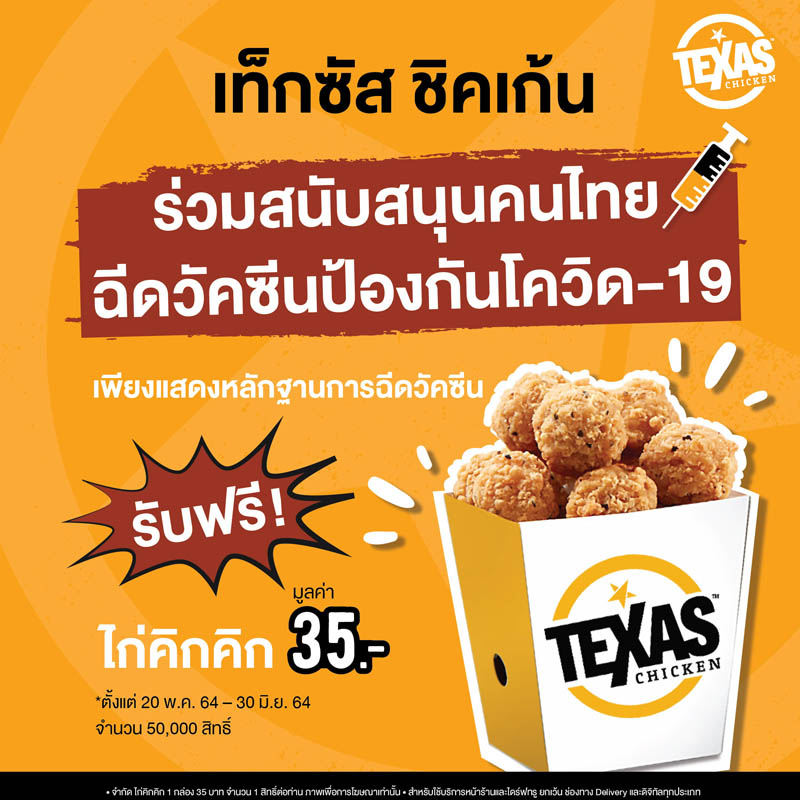 เท็กซัส ชิคเก้น จึงขอมอบสิทธิ์พิเศษให้ลูกค้าทุกท่านที่ให้ความร่วมมือในการฉีดวัคซีนหยุดเชื้อเพื่อชาติ รับฟรี!! ไก่คิกคิก 1 กล่อง มูลค่า 35 บาท ที่ร้านเท็กซัส ชิคเก้นทุกสาขาทั่วประเทศ สำหรับผู้แสดงหลักฐานการฉีดวัคซีนโควิด-19 พร้อม Add Line Official ของเท็กซัสชิคเก้นเพื่อกดรับคูปองจำกัด 1 สิทธิ์ ต่อ 1 ท่านจำนวน 50,000 สิทธิ์ มูลค่ารวม 1,750,000 บาท ตั้งแต่ 20 พฤษภาคม 2564 – 30 มิถุนายน 2564 หรือจนกว่าจะครบสิทธิ์