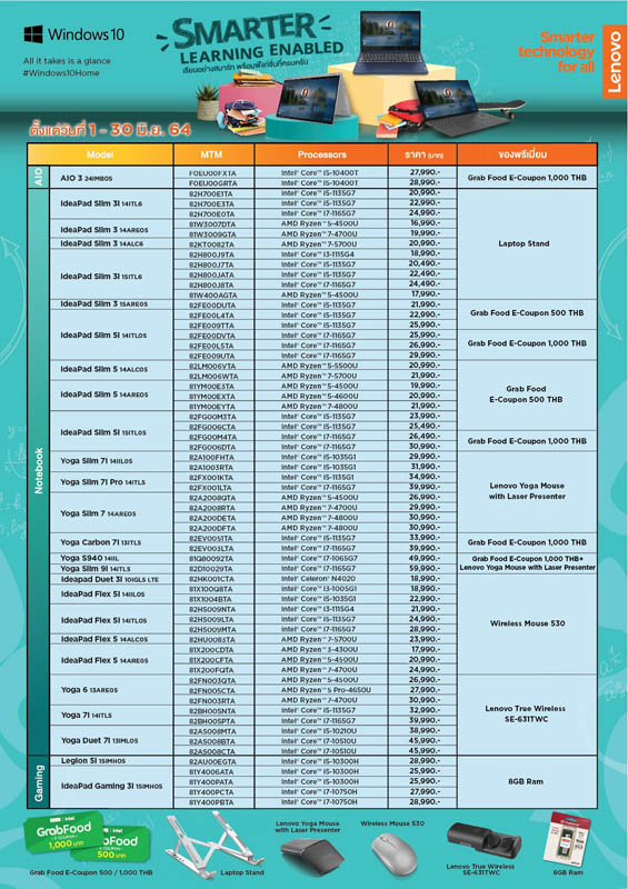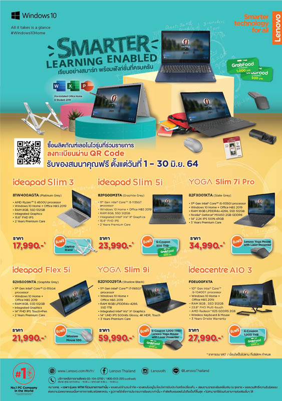 เลอโนโว บริษัทผู้นำด้านคอมพิวเตอร์และสมาร์ทดีไวซ์ระดับโลก จัดแคมเปญโปรโมชั่นผลิตภัณฑ์คอมพิวเตอร์แล็ปท็อปและเดสก์ท็อปราคาพิเศษเหมาะสำหรับนักเรียน นักศึกษา หรือผู้ปกครองที่กำลังมองหาคอมพิวเตอร์ทั้งสำหรับการเรียน และการทำงานกับ 3 ไลน์ผลิตภัณฑ์ อาทิ Lenovo IdeaPad, Lenovo IdeaCentre และ Lenovo Yoga โดยทุกรุ่นมาพร้อมระบบปฏิบัติการณ์ Windows 10 Home และ Microsoft Office Home & Student 2019 ลิขสิทธิ์แท้ นอกจากนี้ยังมีของสมนาคุณมากมาย ไม่ว่าจะเป็น ขาตั้งแล็ปท็อปเมาส์ไร้สายจากเลอโนโว รวมไปถึงคูปองทานอาหารจาก Grab Food สูงสุดถึง 1,000 บาท เมื่อสแกนคิวอาร์โค้ดลงทะเบียนซื้อผลิตภัณฑ์ตั้งแต่วันนี้ จนถึง 30 มิถุนายน 2564 เท่านั้น!
