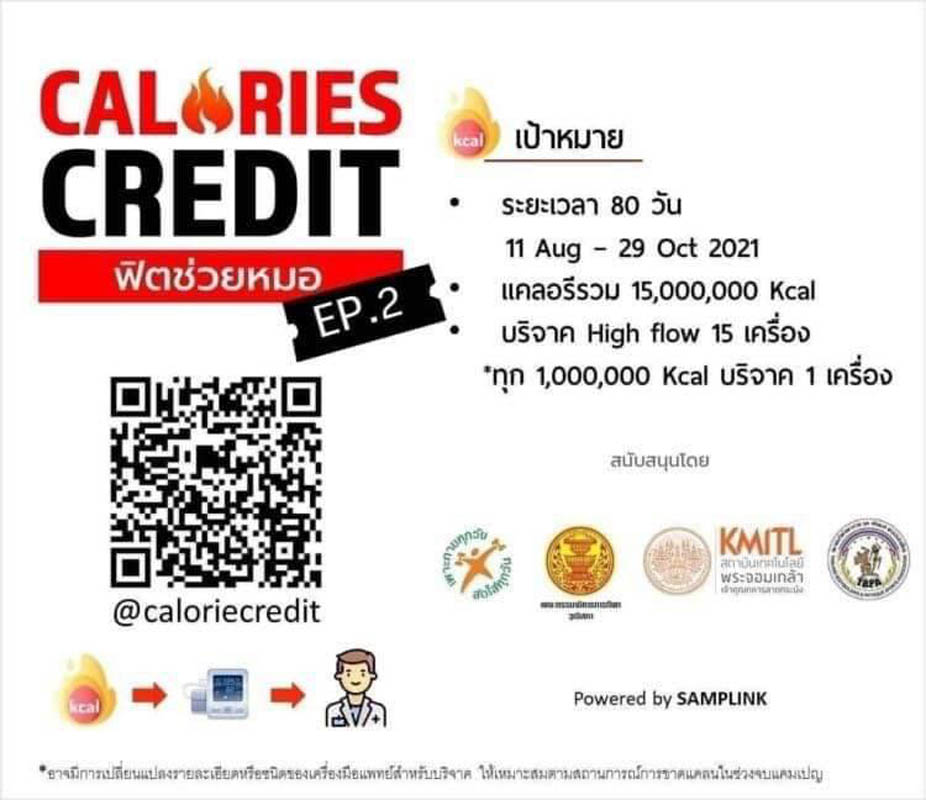 “โดย 7 จังหวัดที่มีผู้เข้าร่วมกิจกรรมแคลอรี่เครดิตฟิตช่วยหมอ อีพี 2 สูงสุดทั้ง 7 จังหวัดนี้จะได้รับเครื่องไฮโฟล์วอ๊อกซิเจนจากสถาบันเทคโนโลยีพระจอมเกล้าเจ้าคุณทหารลาดกระบัง จำนวนหนึ่งเครื่องต่อจังหวัด เพื่อจัดมอบให้แก่โรงพยาบาลที่ขาดแคลนอุปกรณ์ดังกล่าวในจังหวัดของตนต่อไป”