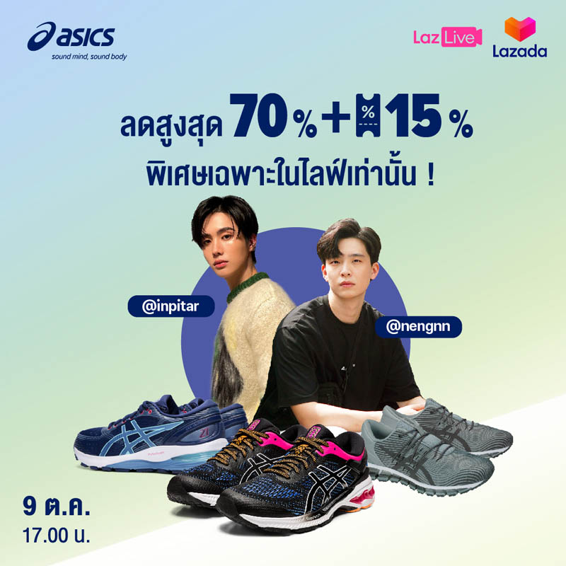 เริ่มต้นมหกรรมลดราคาสุดยิ่งใหญ่กันที่ ASICS Official Store ทาง Lazada กับ Lazada Live ครั้งแรกของ ASICS พิเศษสุด! ยิ่งกว่าครั้งไหนๆ เตรียมพบกับ 2 หนุ่ม อิน สาริน รณเกียรติ และเน๋ง ศรัณย์ นราประเสริฐกุล ASICS Brand Ambassadors ที่จะมานำเสนอสินค้าคุณภาพในราคาสุดคุ้มถึงหน้าจอของคุณ กับรองเท้าวิ่งและสนีกเกอร์สปอร์ตสไตล์ ลดสูงสุดถึง 70%** ในวันที่ 9 ตุลาคมนี้ เวลา 17.00-18.00 น. พร้อมแจกคูปองส่วนลดสุดเอ็กซ์คลูซีฟเก็บได้ใน Live เพียงซื้อสินค้าขั้นต่ำ 800 บาท รับส่วนลดไปเลย 10% ลดสูงสุดถึง 150 บาท (สามารถใช้ได้เฉพาะวันที่ 9 ตุลาคม เวลา 17.00น.-วันที่ 10 ตุลาคม เวลา 23.59 น. เท่านั้น)