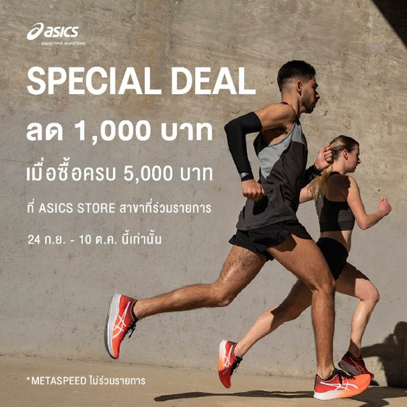 และโปรโมชั่นดีๆ ยังไม่หมดเพียงเท่านี้ สำหรับช่องทาง ASICS.COM เพียงช้อปสินค้าในราคาปกติ 1 ชิ้น ก็รับส่วนลด 20% และหากช้อปสินค้าในราคาปกติ 2 ชิ้น รับส่วนลด 25% พิเศษเฉพาะวันที่ 8-13 ตุลาคมนี้เท่านั้น รวมไปถึงยังมีโปรโมชั่นสุดปังที่ ASICS Store เพียงช้อปสินค้า ASICS ครบ 5,000 บาท รับส่วนลดทันที 1,000 บาท พิเศษ ตั้งแต่วันนี้ถึง 10 ตุลาคมนี้เท่านั้น เหล่าแฟนๆ ASICS และ ASICS SPORTSTYLE ทั้งหลายต้องห้ามพลาด!