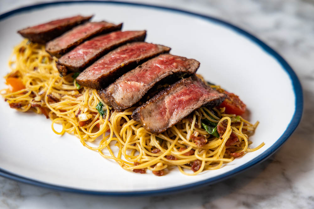 6. “Flat Marble Restaurant” ร้านยอดฮิตในหมู่นักชิมที่ชื่นชอบประสบการณ์ Casual Fine Dining Restaurant ในกรุงเทพฯ รวมถึงคนรักเนื้อที่ชอบเมนูเนื้อที่ปรุงอย่างพิถีพิถัน ชูเมนูไฮไลต์ Fat Beef Fried Rice with Australian Wagyu Striploin Steak โปะด้วยไข่ดาว อุนิ และอิคุระ และเมนู Capellini Aglio Olio e Pepperoncino topped with Australian Wagyu Striploin ทั้งสองเมนูนี้โดดเด่นด้วยรสชาติที่เข้มข้นจากเนื้อสันนอกที่มีชั้นไขมันลายหินอ่อนหนาและเหมาะมากกับการเซียร์ให้ได้รสชาติและกลิ่นเนื้อที่หอมอบอวล และอีกหนึ่งเมนูที่คอเนื้อขาประจำร้านสั่งกันเป็นประจำคือ Butter Australian Wagyu Tenderloin