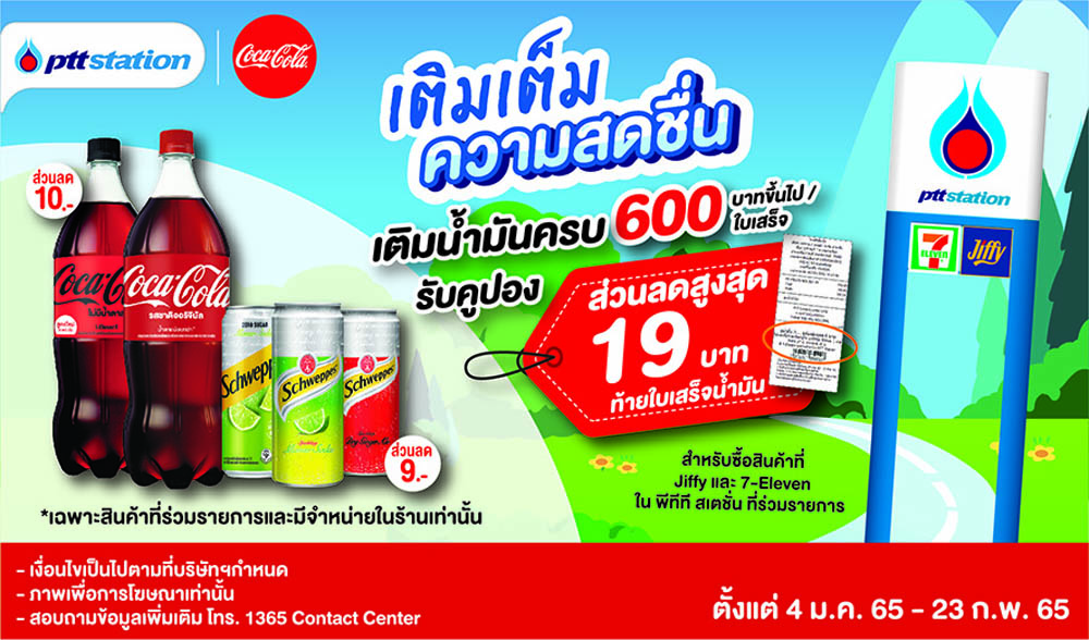 พีทีที สเตชั่นจัดโปรโมชั่นเติมเต็มความสดชื่น คืนความสุขให้ทุกคนต้อนรับปีใหม่ด้วยความซาบซ่าสดใส เมื่อเติมน้ำมันชนิดใดก็ได้ครบ 600 บาทขึ้นไป/ใบเสร็จ รับไปเลยคูปองส่วนลดมูลค่าสูงสุด19 บาท สำหรับแลกซื้อเครื่องดื่มมาเติมเต็มความสดชื่น มีให้เลือกทั้งเครื่องดื่มยอดนิยมอย่าง โค้กหรือโค้กไม่มีน้ำตาล ขนาด 2 ลิตร 2 ขวด ลดเพิ่ม 10 บาทหรือเลือกสดชื่นเต็มพิกัดกับชเวปส์ (ทุกรสชาติ) ขนาด 330 มิลลิลิตร 3 กระป๋องลดเพิ่ม 9 บาทเฉพาะการซื้อสินค้าที่ร้านสะดวกซื้อ Jiffy หรือ 7-Eleven สาขาใน พีทีที สเตชั่น ทุกสาขาที่ร่วมรายการทั่วประเทศ