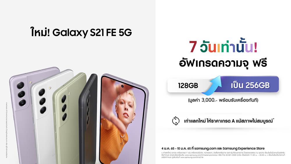 โปรโมชั่นสุดคุ้ม! สำหรับผู้ที่สั่งซื้อในรอบวางจำหน่ายพิเศษตั้งแต่วันที่ 4 – 10 มกราคม 2565 สามารถอัพเกรดความจุจาก 128GB เป็น 256GB ได้ฟรี! มูลค่า 3,000 บาท พร้อมรับเครื่องได้ทันที และยังจะได้รับส่วนลดเพิ่มเติมจากโปรโมชั่นเก่าแลกใหม่อีกด้วย ที่ Samsung Experience Store และ samsung.com คลิกเข้าไปดูรายละเอียดได้แล้ววันนี้ที่ https://www.samsung.com/th/smartphones/galaxy-s21-5g/galaxy-s21-fe-5g/buy/