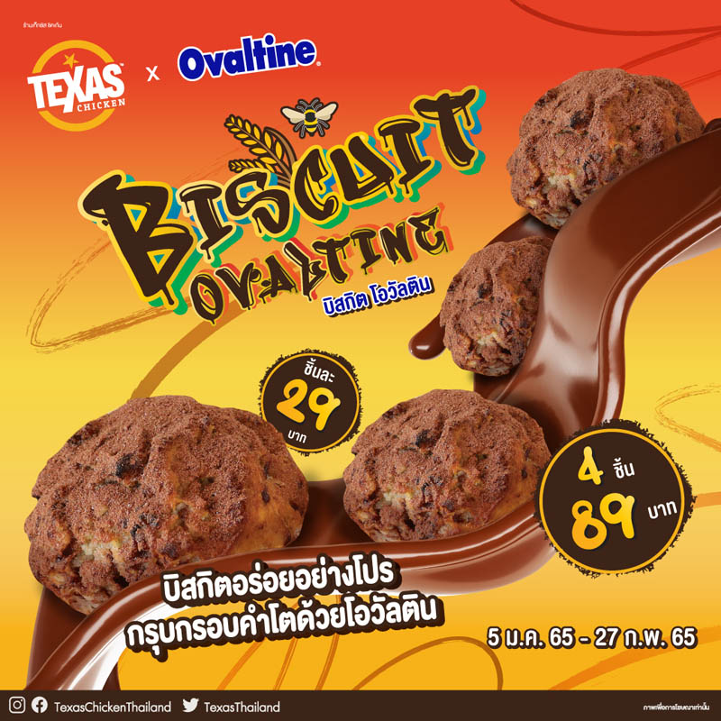 เท็กซัส ชิคเก้น (Texas Chicken) ขอต้อนรับบรรยากาศปีใหม่ด้วยเมนูพิเศษรสชาติหอมหวานเอาใจสายบิสกิต การผสมผสานกันอย่างลงตัวกับเมนู “บิสกิต โอวัลติน” ถูกใจบิสกิตเลิฟเว่อร์ ด้วยฮันนี่บัตเตอร์บิสกิตร้อน ๆ ขนาดพอดีคำ ให้รสสัมผัสกรุบกรอบด้วยโอวัลตินเฟลกแทรกไปกับเนื้อบิสกิตนุ่ม ๆ ฟินไปกับความหอมหวานกลมกล่อมด้วยผงโอวัลตินที่เพิ่มเติมได้ตามความต้องการ ให้ทุกคำอร่อยอย่างโปรกรุบกรอบคำโตด้วยโอวัลติน เมนูใหม่ไม่ซ้ำใครกับ “บิสกิต โอวัลติน” ในราคาเริ่มต้นชิ้นละ 29 บาท และพิเศษ!! ในราคา 4 ชิ้น เพียง 89 บาท ตั้งแต่ 5 มกราคม 2565 – 27 กุมภาพันธ์ 2565 เท่านั้น!! (ราคาอาจแตกต่างกันเมื่อสั่งผ่านช่องทางเดลิเวอรี)