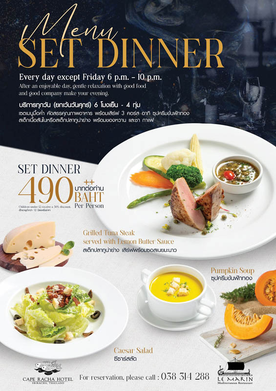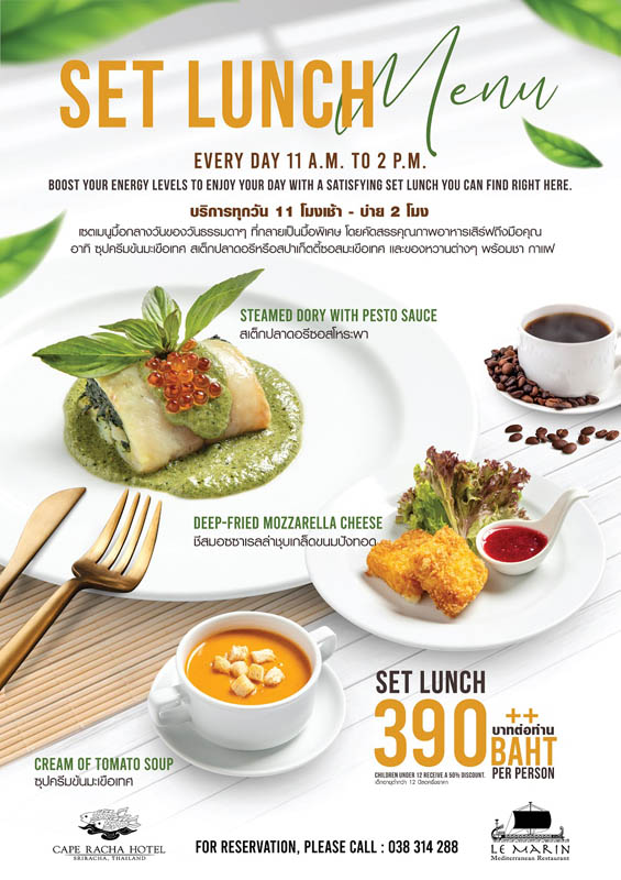 พร้อมเสิร์ฟอาหารเลิศรส 3 คอร์สทั้งมื้อกลางวันและมื้อค่ำ ณ ห้องอาหารเลอ มาแรงน์ ณ โรงแรมเคปราชา ศรีราชา