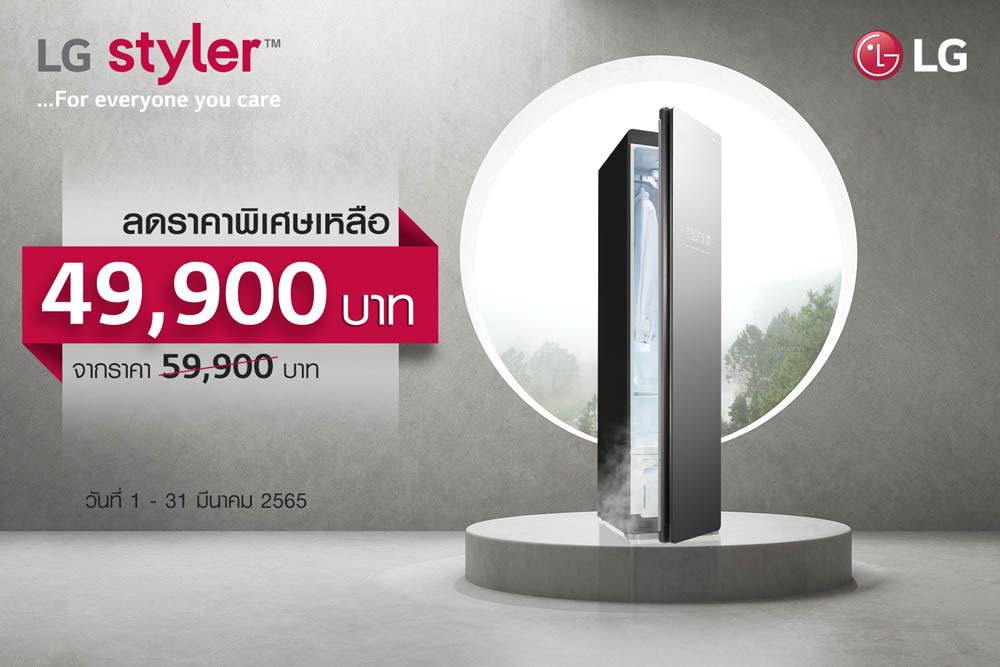 บริษัท แอลจี อีเลคทรอนิคส์ (ประเทศไทย) จำกัด มุ่งส่งเสริมสุขอนามัยที่ดีแก่สมาชิกทุกคนในครอบครัวผ่านนวัตกรรมเครื่องใช้ไฟฟ้าภายในบ้านล่าสุด เปิดมิติใหม่ของการดูแลและทำความสะอาดเสื้อผ้าอย่างครบวงจร เพื่อเพิ่มความมั่นใจทุกครั้งเมื่อออกจากบ้าน ด้วยข้อเสนอเพื่อเอาใจกลุ่มคนรักสุขภาพยุคดิจิทัล ในโปรโมชั่น “LG Styler… For everyone you care” มอบส่วนลดในราคาสุดพิเศษอย่างที่ไม่เคยมีมาก่อนสำหรับผลิตภัณฑ์ตู้ถนอมผ้า LG Styler (รุ่น S3MFC) จากปกติราคา 59,900 บาท เหลือ 49,900 บาท เริ่มวันที่ 1 มีนาคม ถึงวันที่ 31 มีนาคม พ.ศ. 2565 ณ ร้านค้าตัวแทนจำหน่ายของแอลจีและห้างสรรพสินค้าชั้นนำทั่วประเทศ