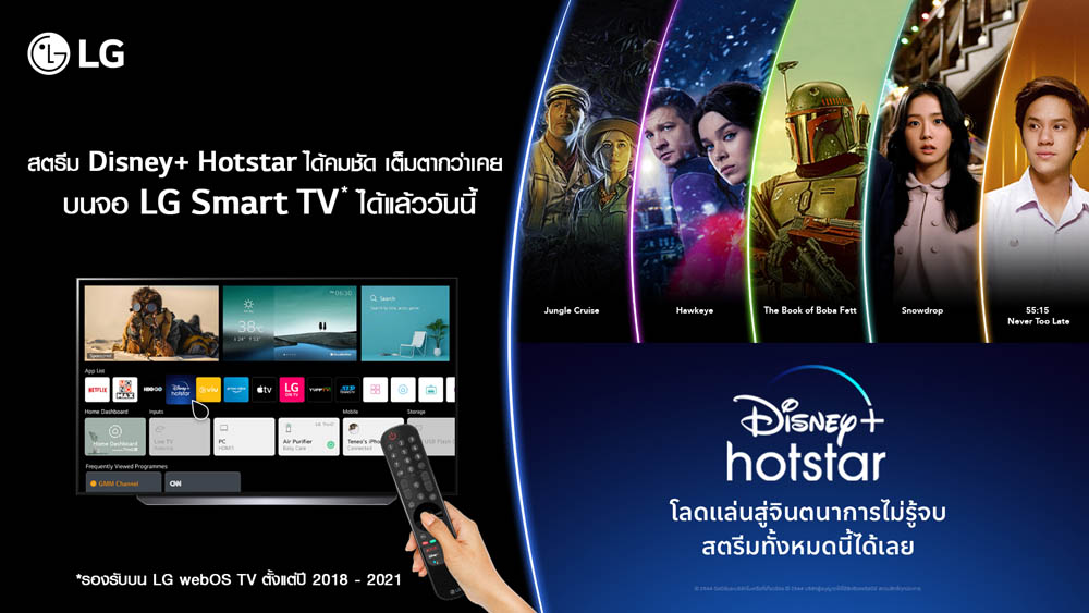 บริษัท แอลจี อีเลคทรอนิคส์ (ประเทศไทย) จำกัด เพิ่มตัวเลือกความบันเทิงที่หลากหลายมากขึ้นสำหรับผู้ที่ใช้งาน LG Smart TV รุ่นที่รองรับระบบปฏิบัติการ webOS 4.0 - 6.0 หรือรุ่นที่วางจำหน่ายตั้งแต่ปี 2018 เป็นต้นไป สามารถสตรีมความบันเทิงจาก Disney+ Hotstar บริการสตรีมมิ่งที่นำเสนอเรื่องราวทั้งในระดับโลก เอเชียและไทยไว้ในที่เดียว โดยผู้ชมจะได้โลดแล่นสู่จินตนาการไม่รู้จบไปกับภาพยนตร์ หรือซีรีส์แฟรนไชส์จากค่ายต่างๆ ในเครือ อาทิ ดิสนีย์, มาร์เวล, สตาร์ วอร์ส, พิกซาร์, และ เนชั่นแนล จีโอกราฟฟิก สามารถใช้งานแอปฯ Disney+ Hotstar ได้แล้วตั้งแต่วันนี้เป็นต้นไป ผ่าน LG App List บนเมนูหน้าจอหลักของ LG Smart TV