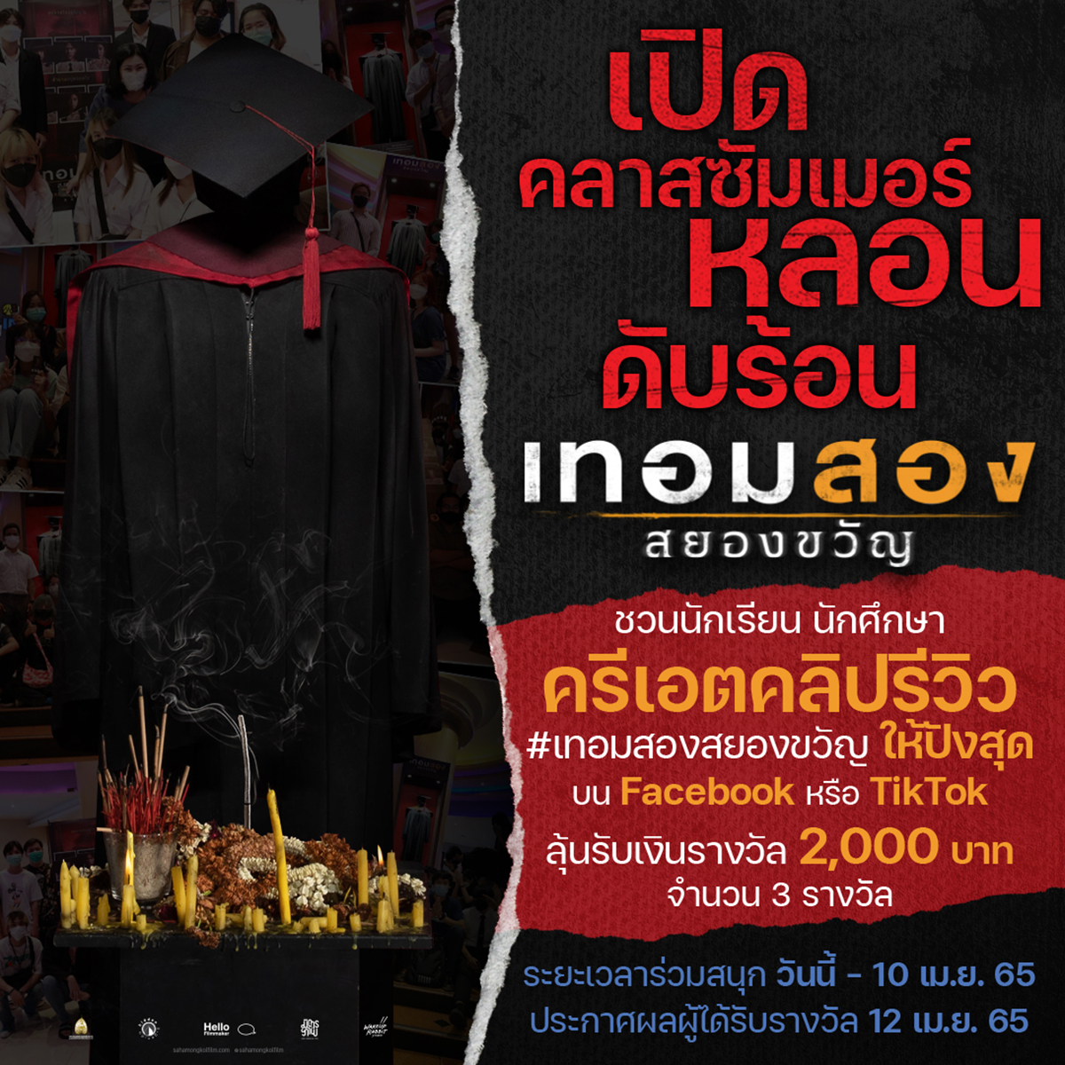 เพื่อตอบรับกับกระแสความแรงของหนัง และรีวิวสุดปังในโลกโซเชียล “สหมงคลฟิล์มฯ” และ “เทอมสอง สยองขวัญ” ขอเปิดคอร์สพิเศษชวนนักเรียนและนักศึกษาทุกสถาบันร่วม “ครีเอตคลิปรีวิว” ภาพยนตร์ #เทอมสองสยองขวัญ ให้ปังสุดในสไตล์ของตัวเอง พร้อมแชร์ลงบน Facebook หรือ TiKTok ของตัวเอง ลุ้นรับเงินรางวัล 2,000 บาท จำนวน 3 รางวัล
