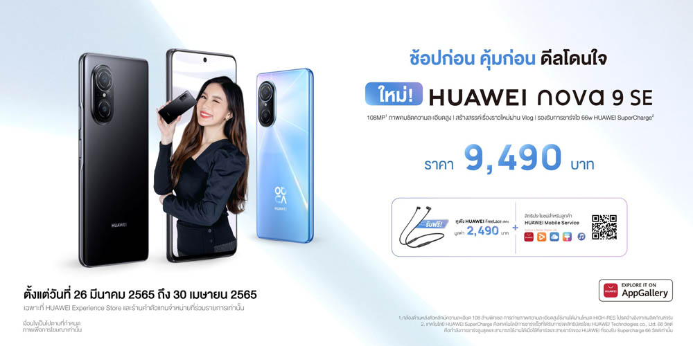 อ่านมาถึงตรงนี้แล้วก็อย่ารอช้า หากอยากได้คอนเทนต์ภาพสวยๆ อัปลงโซเชียล ก็ต้องมีสมาร์ทโฟนคู่ใจดีๆ ราคาสุดคุ้มอย่าง HUAWEI nova 9 SE ในราคาเพียง 9,490 บาท มีให้เลือก 2 สี คือ Crystal Blue และ Midnight Black เมื่อซื้อตั้งแต่วันที่ 26 มีนาคม 2565 ถึงวันที่ 30 เมษายน 2565 รับฟรี! HUAWEI FreeLace มูลค่า 2,490 บาท พร้อมด้วยสิทธิประโยชน์สุดคุ้มมากมาย HUAWEI Video Plus VIP และ HUAWEI Video Movie Pass (1 เดือน) HUAWEI Music Premium (3 เดือน) Exclusive Theme/AODs ที่ออกแบบโดย HUAWEI Theme Studio (1 ปี) HUAWEI Mobile Cloud Storage ความจุ 200GB (1 เดือน) สามารถสั่งซื้อสินค้าทางเว็บไซต์ HUAWEI Store ร้านค้าออนไลน์อย่างเป็นทางการของหัวเว่ยที่ Shopee , Lazada และ JD Central รวมถึงหน้าร้าน HUAWEI Experience Store และร้านค้าตัวแทนจำหน่ายที่ร่วมรายการ