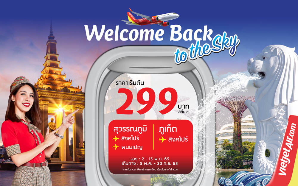 ไทยเวียตเจ็ทเดินหน้าโปรโมทเส้นทางบินระหว่างประเทศด้วยโปรโมชั่น “เวลคัมแบคทูเดอะสกาย” (Welcome Back to the Sky) เสนอบัตรโดยสารราคาพิเศษ เริ่มต้นเพียง 299 บาท (ราคาไม่รวมภาษีและค่าธรรมเนียม) สำหรับเดินทางบนเส้นทางบินบนเครือข่ายเส้นทางบินระหว่างประเทศของไทยเวียตเจ็ท ได้แก่ กรุงเทพฯ (สุวรรณภูมิ) – พนมเปญ สิงคโปร์ โฮจิมินห์ ฮานอย และดานัง รวมทั้งภูเก็ต – สิงคโปร์ ผู้โดยสารสามารถสำรองบัตรโดยสารได้ตั้งแต่วันนี้จนถึงวันที่ 15 พฤษภาคม 2565 เดินทางได้ระหว่างวันที่ 5 พฤษภาคม 2565 – 30 กันยายน 2565 (ยกเว้นวันหยุดนักขัตฤกษ์) ที่ www.vietjetair.com