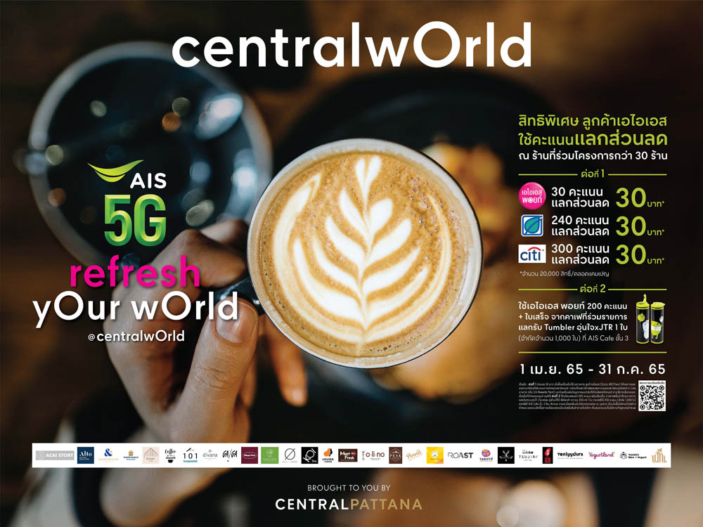 “AIS refresh yOur wOrld” มีร้านค้าชื่อดังที่ร่วมรายการในแคมเปญกว่า 30 ร้าน ได้แก่ Coffee101 x Kuppadeli, The Alley, Acai Story, Alto Coffee Roaster, Ampersand Gelato, Auntie Anne's, Divana Signature Café, Brown, Coffee Arigato, GAGA • Attitude In A Cup, Phoenix Lava, Pennii Popcorn Café, Hannari Cafe De Kyoto, PEAK Chocolate Passionist, Meet fresh, Louisa Coffee, Roast, Yomie's Rice X Yogurt, høst x AMBER, ขมิ้น, Häagen-Dazs, KOI THE', Olino Crepe & Tea, TAROTO Dessert, TSUJIRI, Xing Fu Tang, Yogurtland, YenlyYours Dessert และ Mikka Café เป็นต้น อีกทั้งยังขยายเวลาแคมเปญให้คุณสดชื่นยาวไปถึงวันที่ 31 ก.ค.2565 ส่วนจะมีร้านคาเฟ่ร้านใดหมุนเวียนมาเปิดให้บริการที่ AIS Café เพิ่มเติมติดตามได้ที่ Facebook fan page: CentralWorld อย่าลืมวะมาใช้ AIS points แลกรับส่วนลดได้ตั้งแต่เวลา 10.00 น. – 22.00 น. ณ ชั้น 3 โซนเอเทรียม ศูนย์การค้าเซ็นทรัลเวิลด์
