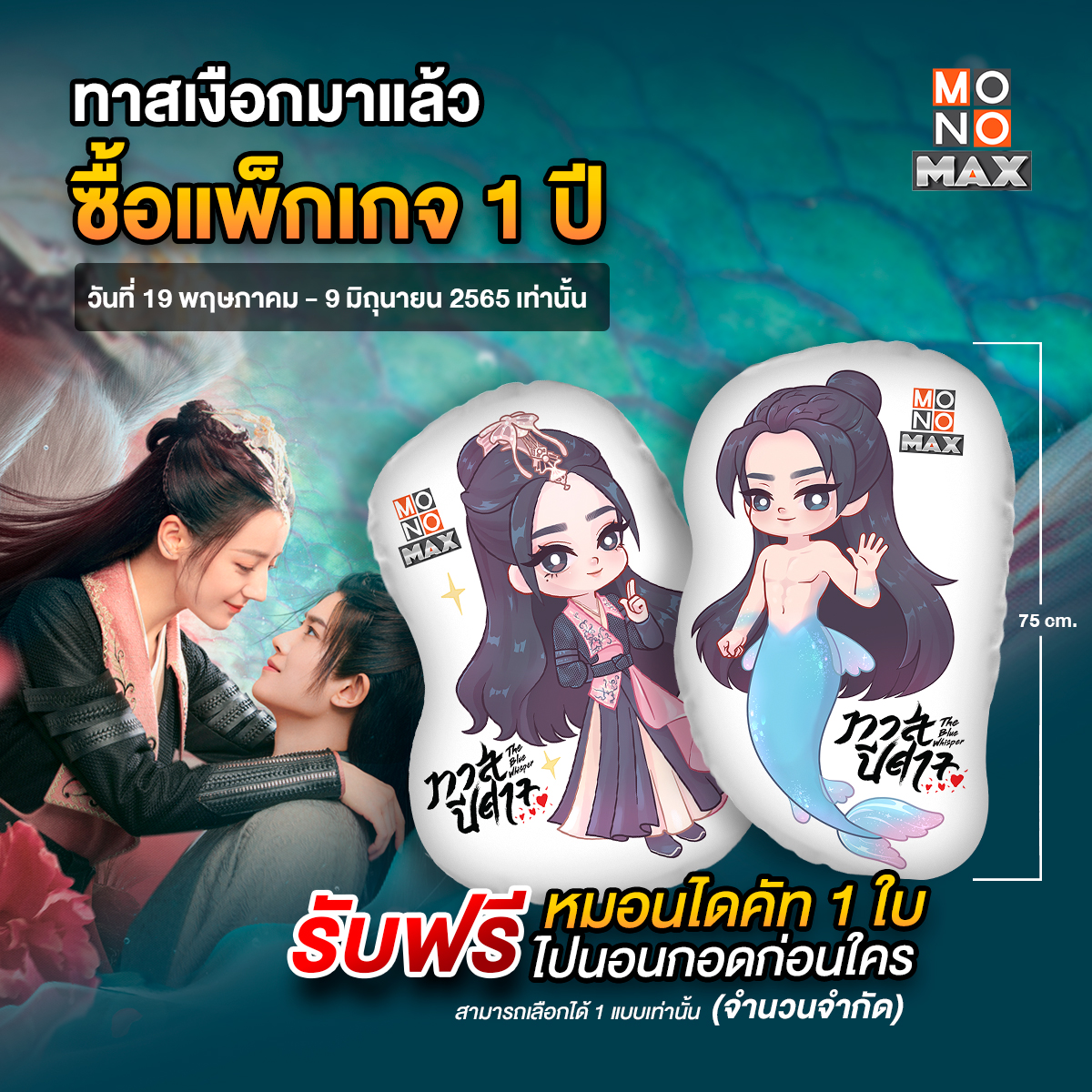 สาวกซีรีส์ “The Blue Whisper ทาสปีศาจ” ฟังทางนี้!!! เตรียมพร้อมลงจอให้ได้ชมกันแบบเต็ม ๆ แล้ว ทาง “MONOMAX” (โมโนแมกซ์) สุดยอดหนังดี ซีรีส์ดัง พากย์ไทยครบทุกเรื่อง ในวันที่ 10 มิ.ย.นี้ โดยขอเอาใจคนรัก “เหรินเจียหลุน” และ “ตี๋ลีเร่อปา” มอบสิทธิพิเศษแก่ลูกค้าที่ซื้อแพ็กเกจรายปี MONOMAX (โมโนแมกซ์) แลกรับหมอนไดคัทสุดพิเศษจากซีรีส์ “ทาสปีศาจ The Blue Whisper” ทันที จำนวน 1 ใบ (มีให้เลือก 2 แบบ ขนาดความสูง 75 เซ็นติเมตร) ตั้งแต่วันนี้ - 9 มิถุนายนนี้ เท่านั้น สอบถามรายละเอียดเพิ่มเติมโทร 02-100-7007 หรือทาง Facebook Fanpage : MONOMAX