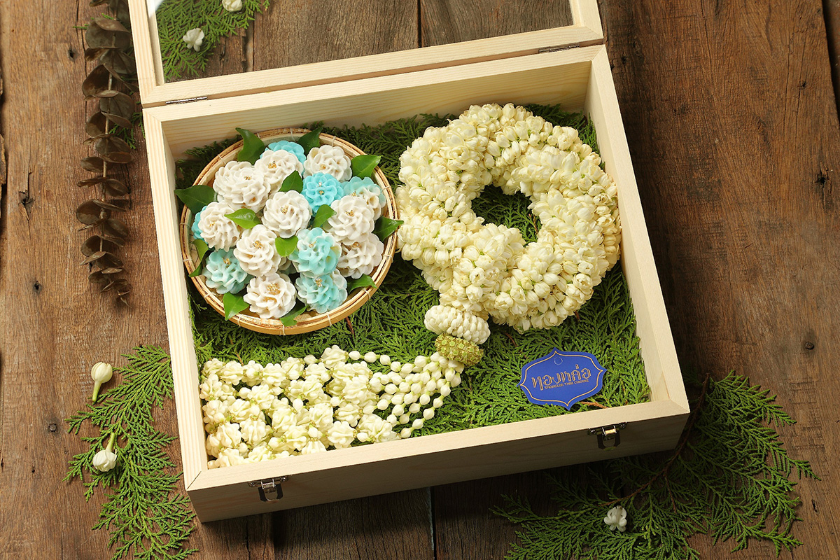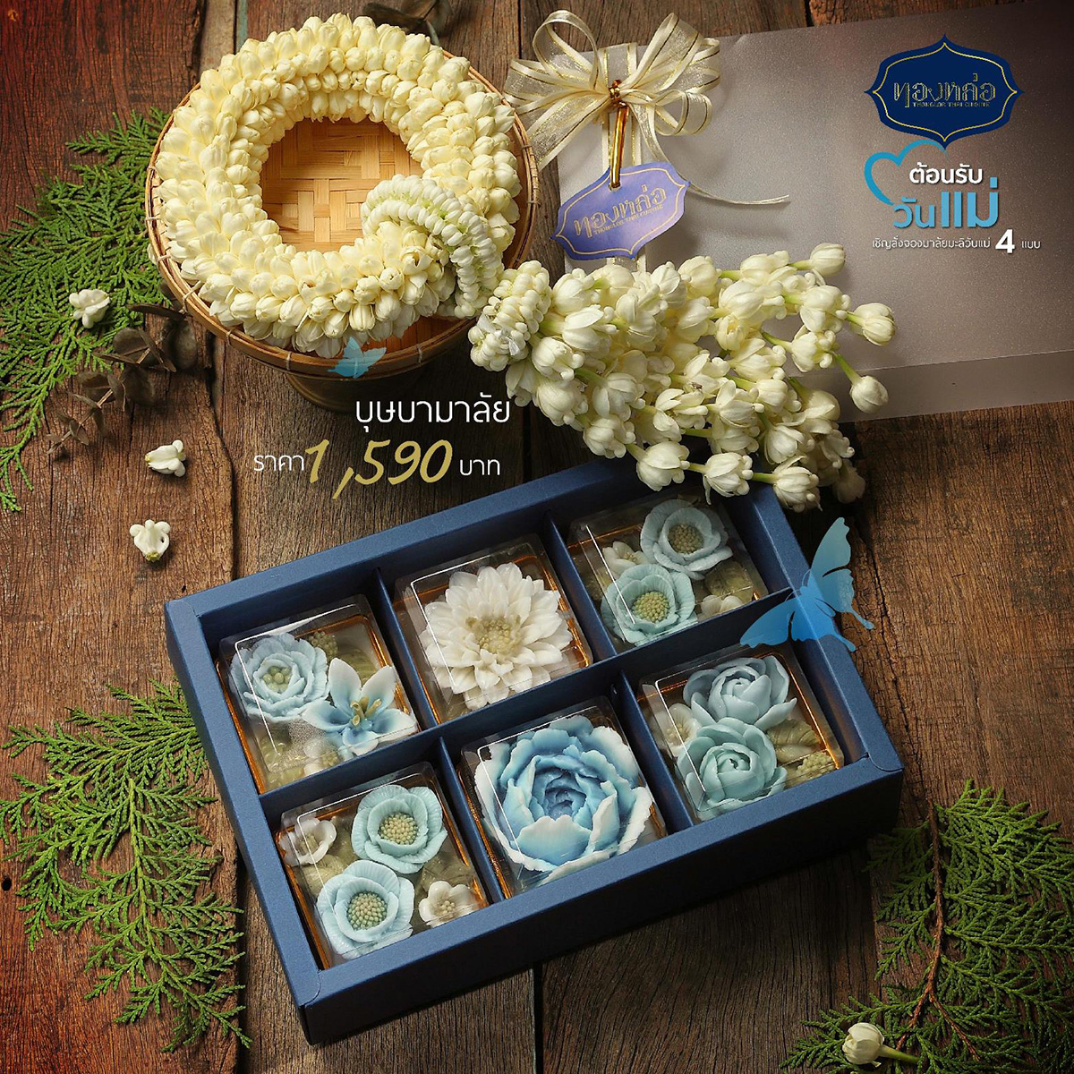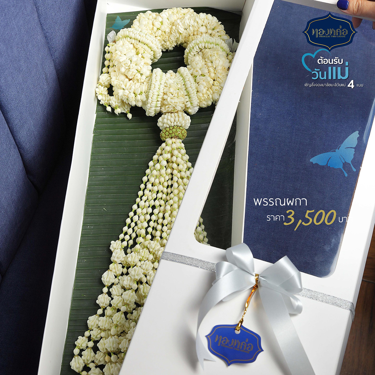 4. กล่องมะลิซ้อนบอกรัก กล่องขนมช่อมะลิสดบรรจุคู่กับมาลัยมะลิเกลียว กลิ่นหอม สำหรับความรักบริสุทธิ์และยาวนานไม่เสื่อมคลายของแม่ ราคา 3,690 บาท
