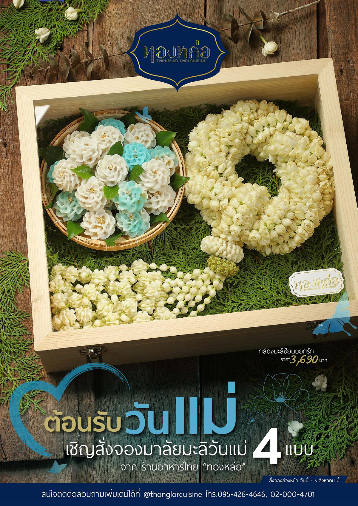 ร้านอาหารไทย “ทองหล่อ” ต้อนรับเทศกาลวันแม่ เปิดรับออเดอร์สำหรับสั่งจองพวงมาลัยมะลิสดสุดประณีต แทนคุณค่าความรักที่บริสุทธิ์ในราคาเริ่มต้น 1,590 - 3,690 บาท สามารถสั่งจองได้ตั้งแต่ วันนี้ – 5 สิงหาคม ศกนี้ และรับของได้ในวันที่ 10 - 13 สิงหาคม ศกนี้ พร้อมบริการจัดส่งถึงบ้านด้วยแกร็ป (คิดค่าบริการจริงตามระยะทาง)