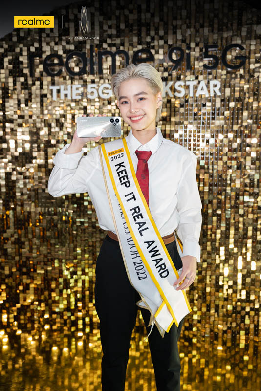 วาด ญาณิน เจริญธนา จากคณะ Louis Nobiron School of Music ผู้คว้าตำแหน่ง Keep It Real Award Presented by realme กล่าวว่า “ขอขอบคุณ realme ที่ร่วมสนับสนุนเจเนอเรชันใหม่อย่างพวกเราให้กล้าเผยตัวตนบนแนวทางที่สร้างสรรค์ในครั้งนี้ ส่วนตัวรู้สึกประทับใจมากตั้งแต่ได้ร่วมทำกิจกรรมเวิร์กชอปเมื่อวันที่ 7 ที่ผ่านมา ซึ่งได้ทดลองใช้ฟังก์ชันต่าง ๆ ของ realme 9i และใช้ถ่ายรูประหว่างการประกวดด้วย และชอบในความเป็น realme เพราะตนเองก็มีหลายอย่างที่ตรงกับความหมายของคำว่า realme ทั้งสไตล์ การแต่งตัว ทุกๆอย่างที่เป็นตัวเอง ซึ่งเชื่อว่าความเรียลนี้จะไม่เหมือนใครอย่างแน่นอน และเมื่อทราบผลว่าได้ตำแหน่ง Keep It Real Award Presented by realme ก็ยิ่งรู้สึกดีใจมาก ๆ ที่จะได้มีโอกาสร่วมงานกับแบรนด์ระดับโลกอย่าง realme และจะพยายามทำหน้าที่ที่ได้รับมอบหมายให้ดีที่สุด”