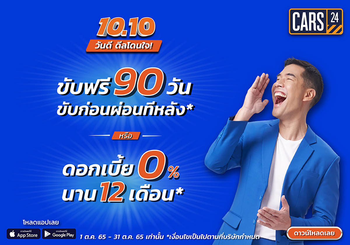 “CARS24” จัดโปรฯ “10.10 วันดีดีลโดนใจ” ที่ใคร ๆ ต้องร้องว้าว! ขับฟรี 90 วัน ขับก่อนผ่อนทีหลัง หรือรับดอกเบี้ย 0% นาน 12 เดือน ตุลาคมนี้เท่านั้น!
