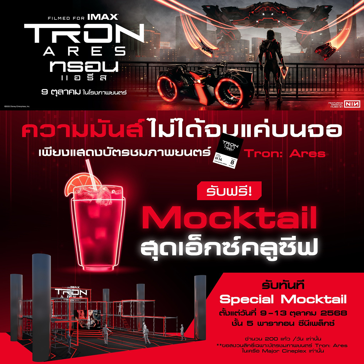 ไปมันกับประสบการณ์ไซไฟสุดล้ำใน “Tron: Ares ทรอน แอรีส” พร้อมกัน 9 ตุลาคมนี้ ในโรงภาพยนตร์และระบบ IMAX ทั่วประเทศ พิเศษ สำหรับแฟน ๆ ที่มีบัตรชมภาพยนตร์เรื่อง “Tron: Ares ทรอน แอรีส” ในเครือ Major Cineplex สามารถนำบัตรมาเข้าชม “Tron: Ares Light Installation” เพื่อสัมผัสโลกของกริดสุดล้ำ พร้อมรับม็อกเทลฟรี ท่านละ 1 แก้ว (จำกัดจำนวนวันละ 200 แก้ว) ที่ Infinicity Hall ชั้น 5 สยาม พารากอน ตั้งแต่วันที่ 9-13 ตุลาคมนี้