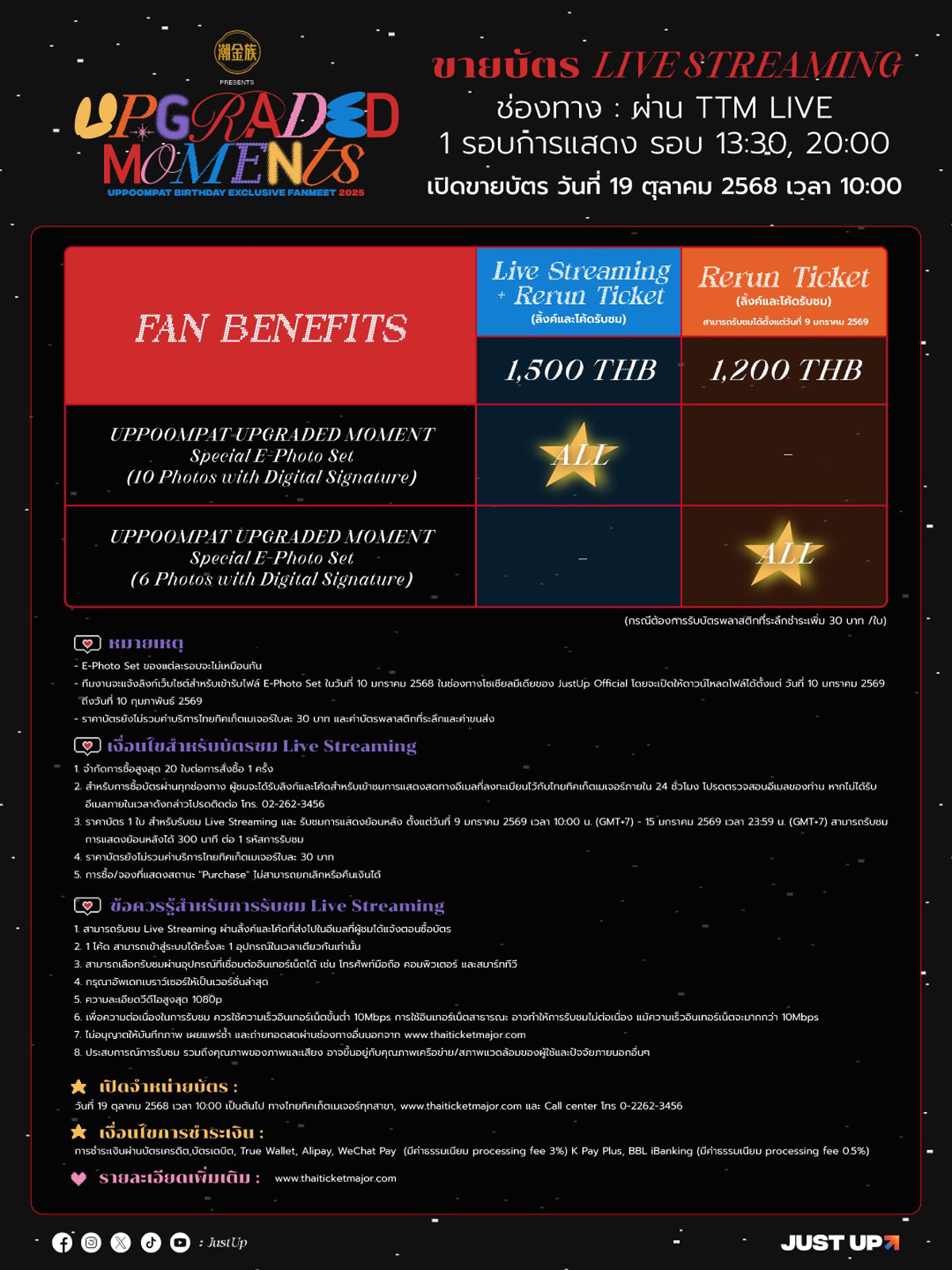 สำหรับผู้สนใจเตรียมตัวให้พร้อม! เปิดจำหน่ายบัตร Live Streaming งาน “Tide Gold Tribe Presents UPGRADED MOMENTS UPPOOMPAT BIRTHDAY EXCLUSIVE FANMEET 2025” ในวันอาทิตย์ที่ 19 ตุลาคม 2568 เวลา 10.00 น. บัตรราคา 1,500 บาท(ลิ้งค์และโค้ดรับชม) ผ่านทาง www.thaiticketmajor.com และติดตามรายละเอียดเพิ่มเติมได้ที่ JustUp official : Facebook / Instagram / X #UPPOOMPATBD2025 #UpgradedMoment #uppoompat
