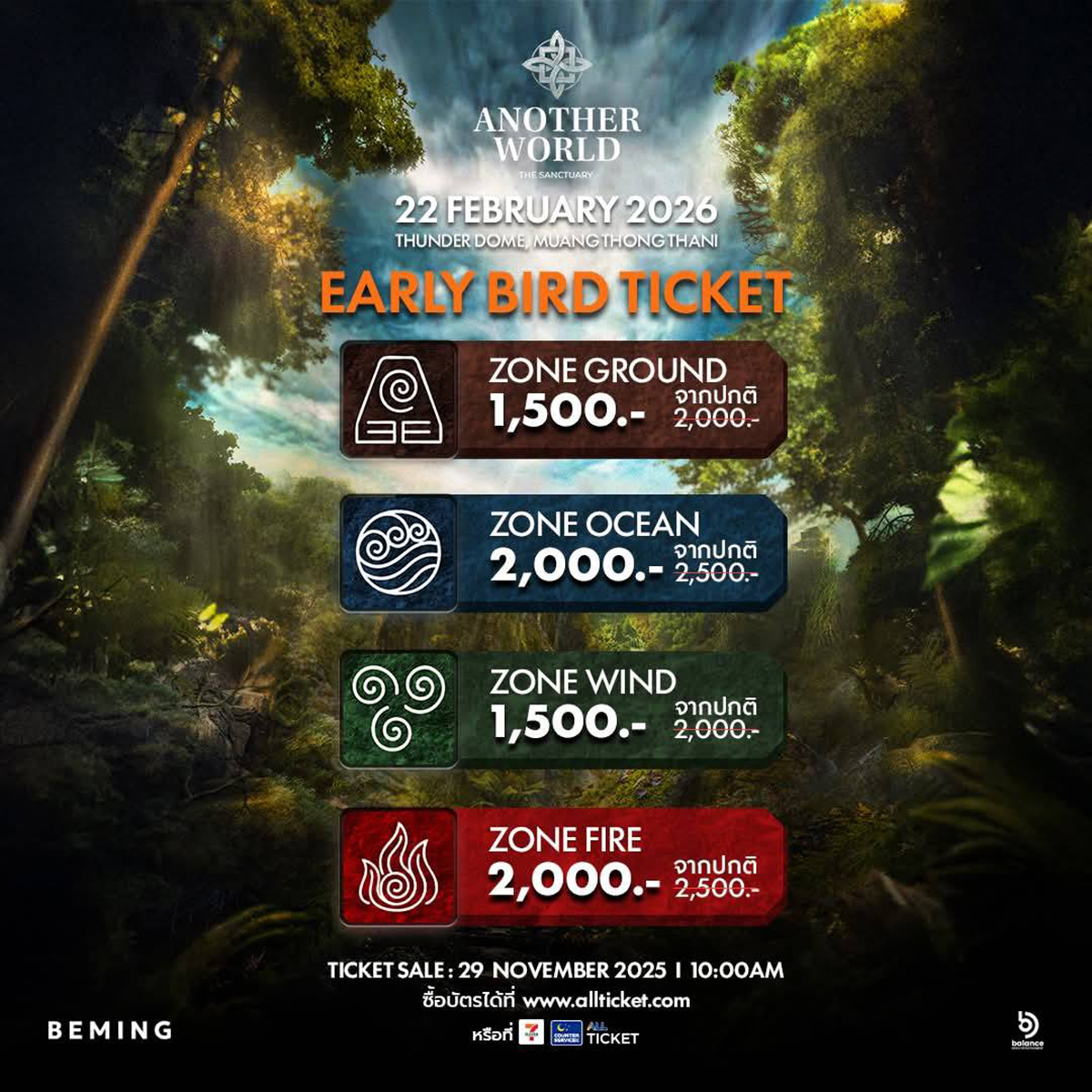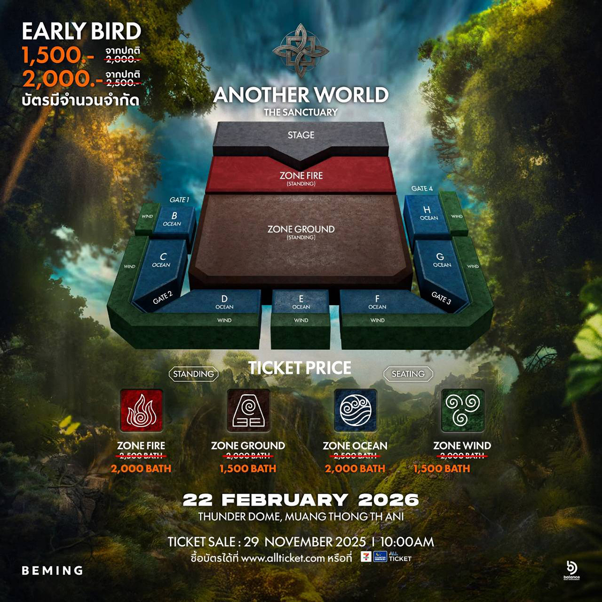ANOTHER WORLD: THE SANCTUARY CONCERT 2026 งานที่ทุกคนรอคอยกลับมาแล้วในรูปแบบที่ยิ่งใหญ่กว่าเดิม พร้อมโปรดักชันจัดเต็มระดับเทศกาลดนตรี ในวันอาทิตย์ที่ 22 กุมภาพันธ์ 2026 ณ Thunder Dome เมืองทองธานี เปิดขายบัตร Early Bird วันเสาร์ที่ 29 พฤศจิกายน 2568 นี้ ตั้งแต่ 10.00 น. เป็นต้นไป ทาง ALLTICKET และ Counter Service All Ticket ที่ร้าน 7-Eleven ทุกสาขา โดยบัตรแบ่งออกเป็น 4 โซน ได้แก่
