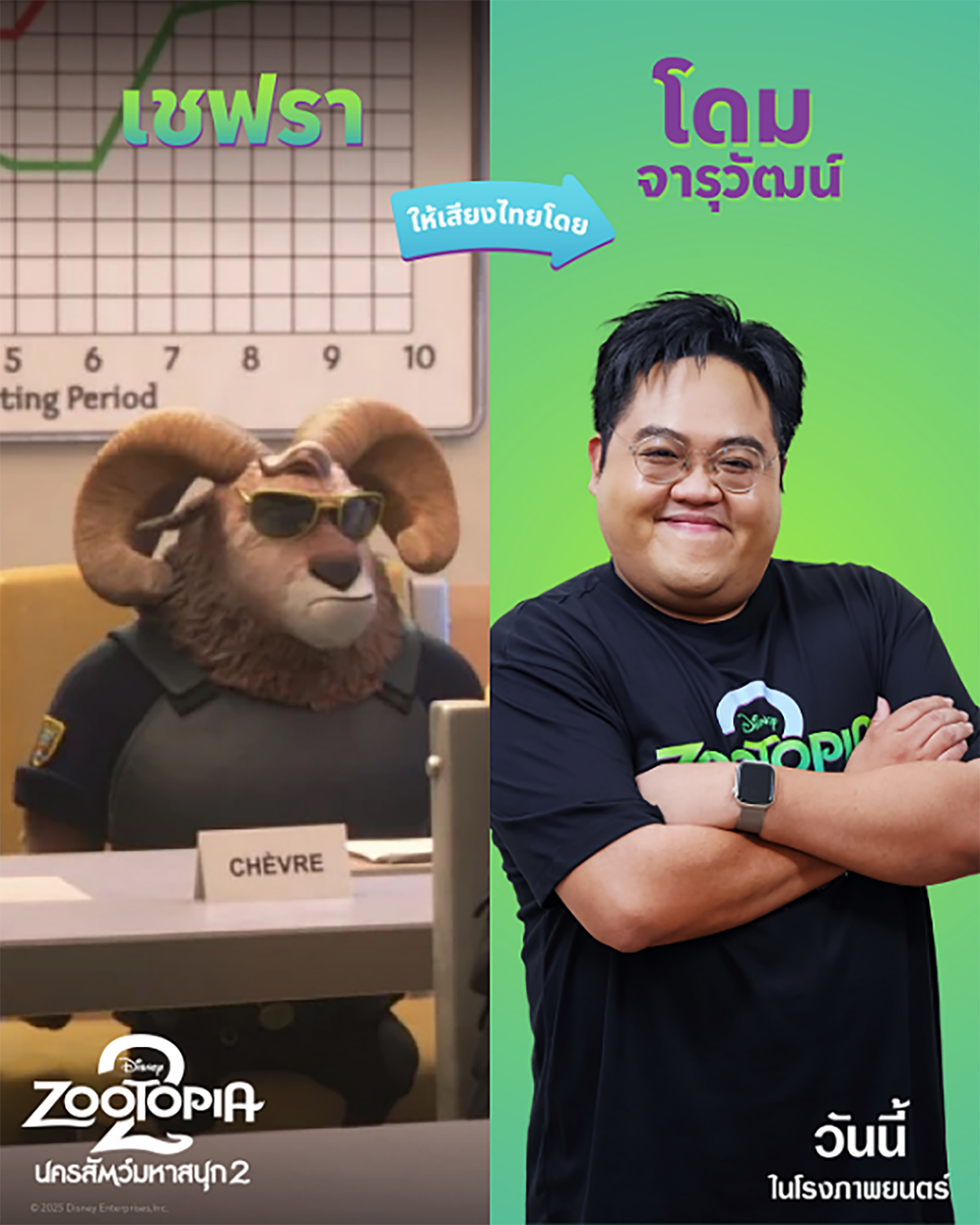 โดม จารุวัฒน์ ให้เสียงไทยเป็น “เชฟรา” (Chevre) แพะตัวผู้สุดดุดันที่ทำงานให้กับ กรมตำรวจซูโทเปีย ร่วมกับคู่หู เจ้าหน้าที่บูเชอรอน (Bûcheron)