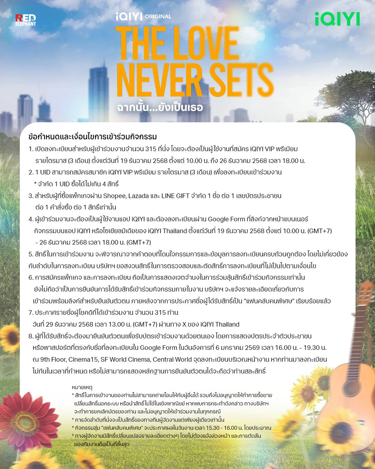 มาร่วมเป็นส่วนหนึ่งและลุ้นไปจบไปกับพวกเขาได้ในงาน “iQIYI Original The Lover Never Sets Final EP : The Red Sunflower” สามารถติดตามซีรีส์ iQIYI Original “The Love Never Sets ฉากนั้น…ยังเป็นเธอ” ได้ทุกวันอังคาร เวลา 20:00 น. ดูออนไลน์บนแอป iQIYI (อ้ายฉีอี้) และเว็บ www.iQ.com ที่เดียวเท่านั้น