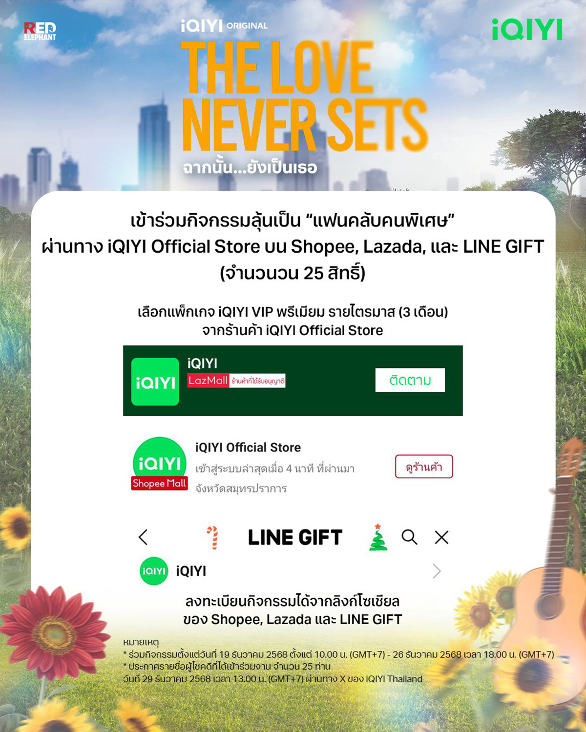 สำหรับวิธีการการเข้าร่วมกิจกรรม เพียงสมัครสมาชิก iQIYI VIP แบบพรีเมียม รายไตรมาส (3 เดือน) ผ่านแอป iQIYI (อ้ายฉีอี้) หรือ Shopee, Lazada และ LINE GIFT ตั้งแต่วันนี้ - 26 ธันวาคม 2568 เวลา 18.00 น. หลังจากนั้นลงทะเบียนผ่าน Google Form ที่ลิงก์จากหน้าแบนเนอร์กิจกรรมบนแอป iQIYI (อ้ายฉีอี้) หรือโซเชียลมีเดียของ iQIYI Thailand โดยจะประกาศผลผู้ที่ได้ร่วมงานในวันที่ 29 ธันวาคม 2568 เวลา 13.00 น.สามารถติดตามรายละเอียดและเงื่อนไขได้ทางโซเชียลมีเดียของ iQIYI Thailand