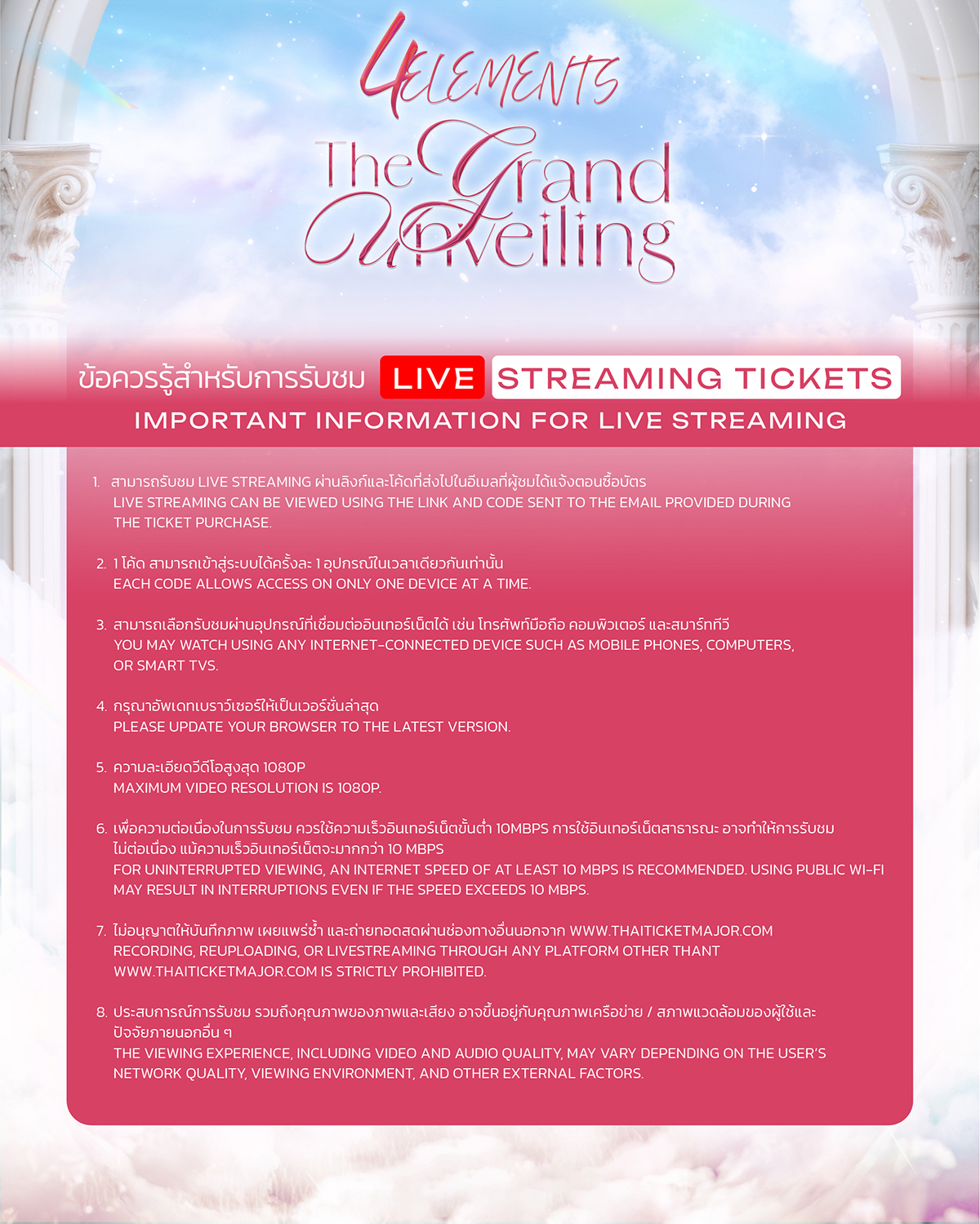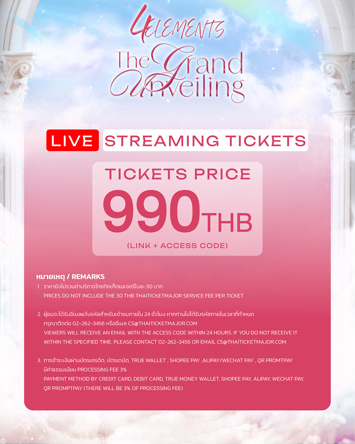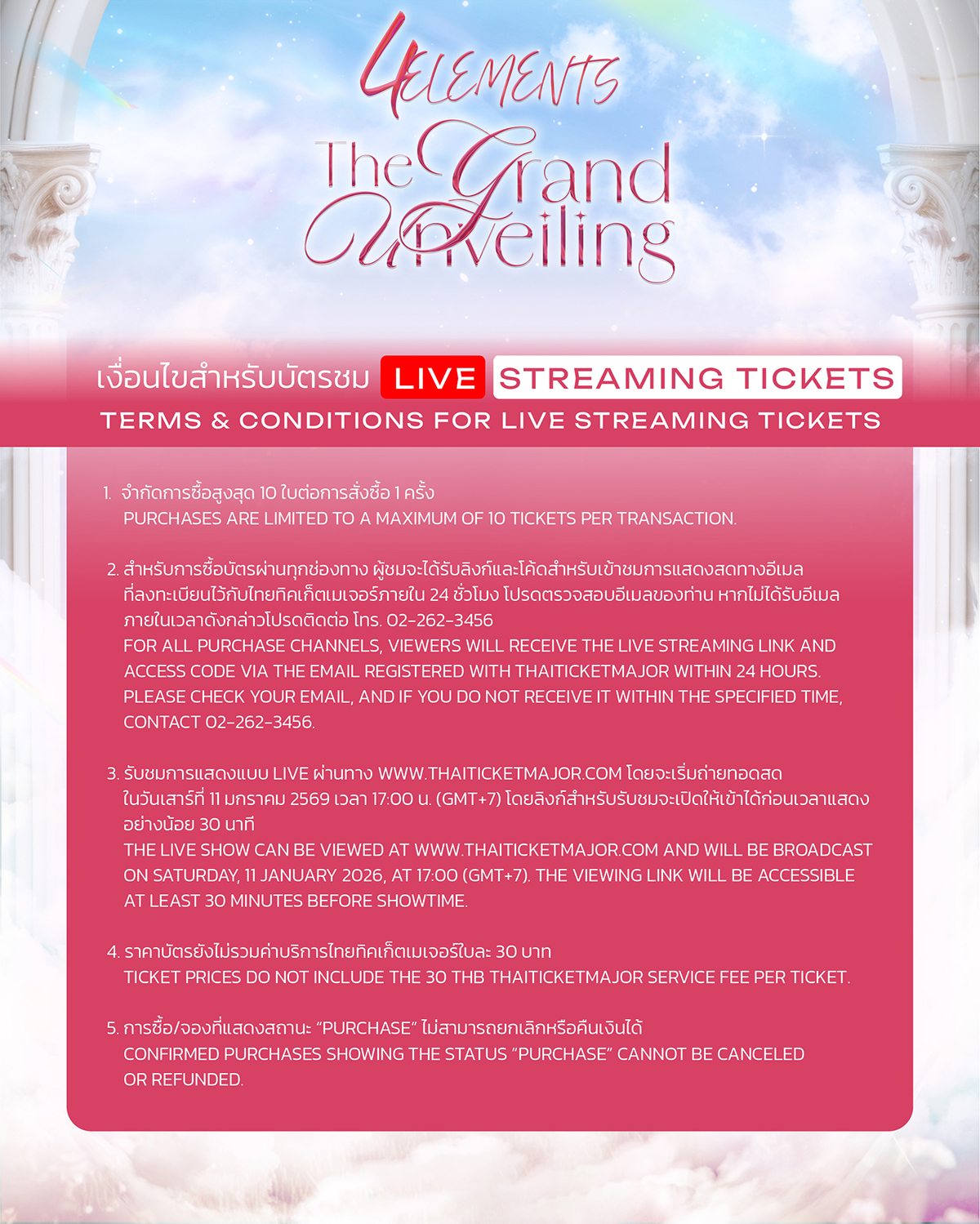 สำหรับผู้สนใจสามารถติดตามรายละเอียดการจำหน่ายบัตรได้ทาง https://www.thaiticketmajor.com/performance/4-elements-the-grand-unveiling.html และรับชมการแสดงแบบ Live ผ่านทาง www.thaiticketmajor.com ในวันเสาร์ที่ 11 มกราคม 2569 เวลา 17:00 น. โดยลิงก์สำหรับรับชมจะเปิดให้เข้าได้ก่อนเริ่มเวลาแสดงอย่างน้อย 30 นาที เอาล่ะสิ!! งานนี้ห้ามพลาด แล้วมาเกาะขอบจอรอฟินแบบเกินต้านไปพร้อมกัน