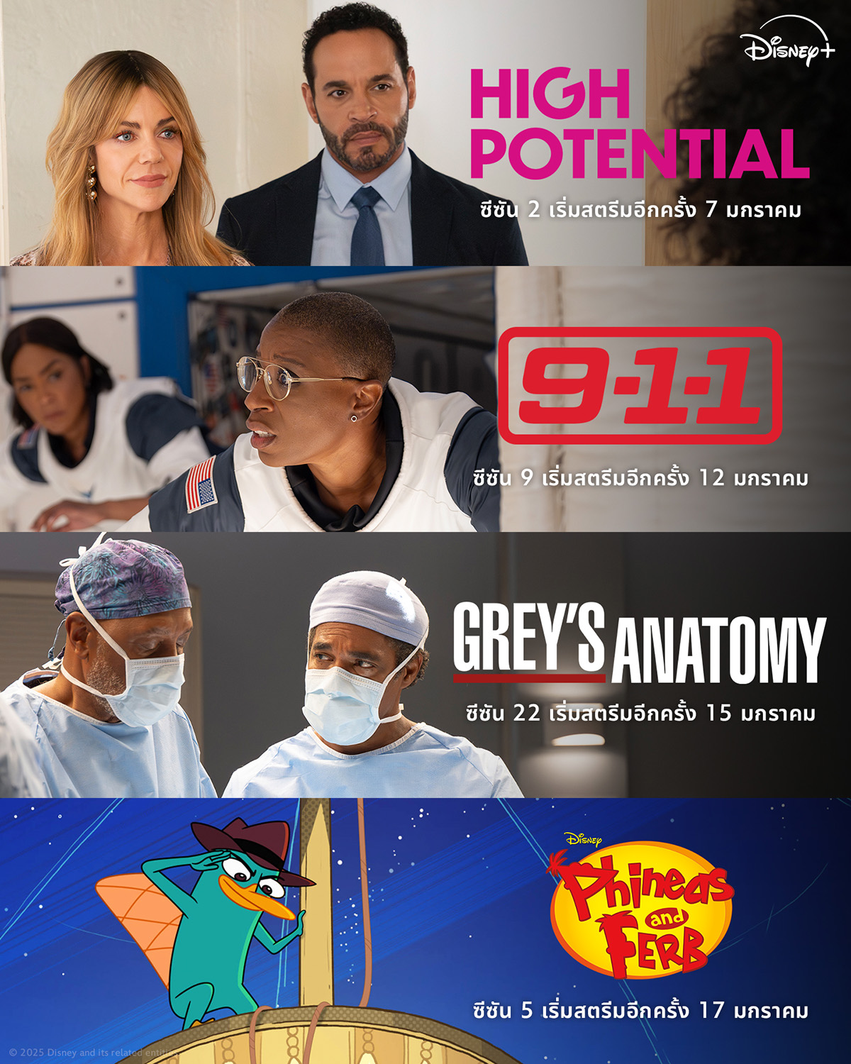 แฟน ๆ สามารถสตรีมซีรีส์ยอดนิยมจากฝั่งอเมริกาที่กลับมาสตรีมตอนใหม่ได้บน Disney+ ไม่ว่าจะเป็น High Potential ซีซัน 2, 9-1-1 ซีซัน 9, Grey’s Anatomy ซีซัน 22 และ Phineas and Ferb ซีซันใหม่รวมถึงอีกหลากหลายคอนเทนต์ที่กลับมาสตรีมได้อย่างต่อเนื่องบน Disney+ ที่นี่ที่เดียว