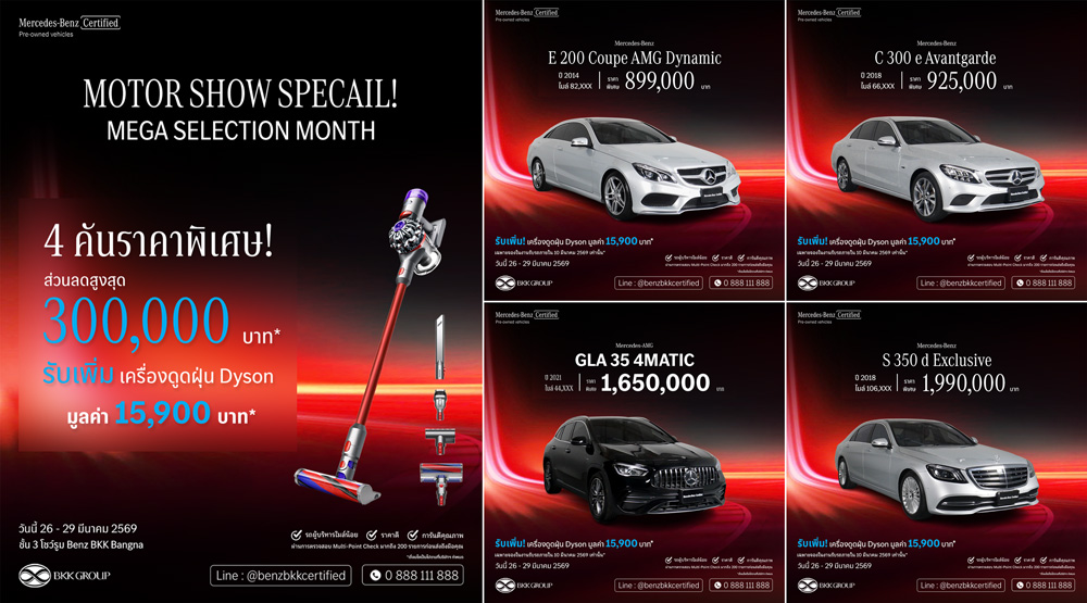 Benz BKK Group-Bangna ผู้แทนจำหน่ายและศูนย์บริการรถยนต์ Mercedes-Benz อย่างเป็นทางการ เปิดตัวแคมเปญ “MOTOR SHOW SPECIAL!” ภายใต้ไลน์ Mercedes-Benz Certified by Benz BKK Bangna เพื่อตอบรับช่วงเวลาสำคัญของอุตสาหกรรมยานยนต์อย่าง Motor Show ซึ่งเป็นช่วงที่ผู้บริโภคมีความต้องการและความพร้อมในการตัดสินใจสูง โดยนำเสนอข้อเสนอพิเศษสำหรับลูกค้าที่ต้องการเป็นเจ้าของรถยนต์เมอร์เซเดส-เบนซ์คุณภาพระดับพรีเมียม ในราคาที่เข้าถึงได้ พร้อมมาตรฐานการรับรองจากเมอร์เซเดส-เบนซ์ โดยงานจะจัดขึ้นระหว่างวันที่ 26 – 29 มีนาคม 2569 ณ ชั้น 3 โชว์รูม Benz BKK Bangna