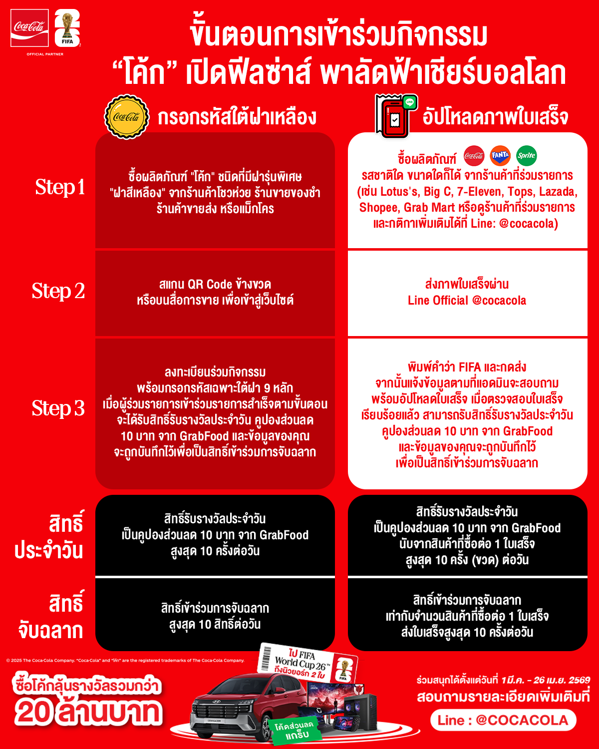 • ช่องทางที่ 2: อัปโหลดใบเสร็จ พาลุ้นโชค เพียงซื้อผลิตภัณฑ์ “โค้ก” “แฟนต้า” หรือ “สไปรท์” รสชาติใด ขนาดใดก็ได้ จากร้านค้าที่ร่วมรายการ (เช่น 7-Eleven, Lotus’s, Big C, Tops, Grab Mart ฯลฯ) จากนั้นอัปโหลดภาพใบเสร็จและกรอกข้อมูลผ่าน LINE Official Account @cocacola ตามขั้นตอนที่จะได้รับแจ้งทาง LINE ต่อไป (เมื่อสำเร็จตามขั้นตอน จะได้รับสิทธิ์รับรางวัลประจำวันเป็นคูปองส่วนลด 10 บาท จาก Grab โดยคูปองส่วนลดจะถูกส่งผ่าน LINE Official Account @cocacola หลังจากใบเสร็จได้รับการตรวจสอบและยืนยันเรียบร้อยแล้ว)