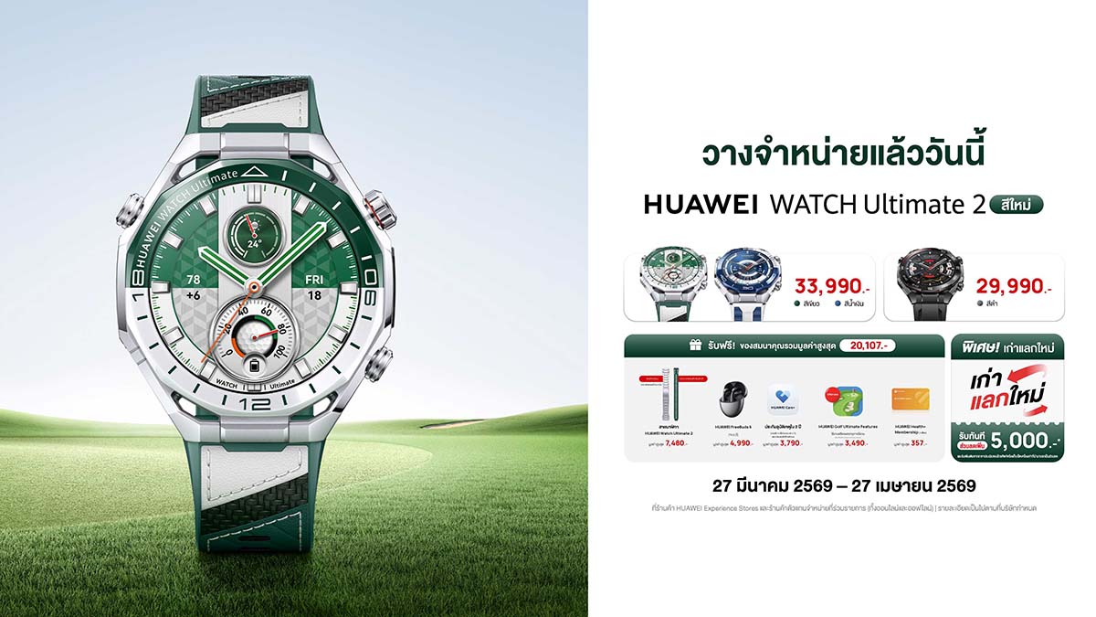 HUAWEI WATCH Ultimate 2 วางจำหน่ายในสีเขียว (สีใหม่) และสีน้ำเงิน ราคา 33,990 บาท ส่วนสีดำราคา 29,990 บาท พร้อมรับของสมนาคุณสุดคุ้มรวมมูลค่าสูงสุด 20,107 บาท เมื่อเป็นเจ้าของระหว่างวันที่ 27 มีนาคม 2569 ถึงวันที่ 27 เมษายน 2569 ได้แก่ สายนาฬิกาเสริม HUAWEI Watch Ultimate 2 มูลค่าสูงสุด 7,480 บาท, HUAWEI FreeBuds 6 (เฉพาะรุ่นที่กำหนด) มูลค่าสูงสุด 4,990 บาท, ประกันอุบัติเหตุ 2 ปี HUAWEI Care+ มูลค่าสูงสุด 3,790 บาท, HUAWEI Golf Ultimate Features (เปิดใช้งานฟรีตลอดชีพ) มูลค่าสูงสุด 3,490 บาท และ HUAWEI Health+ Membership มูลค่าสูงสุด 357 บาท พร้อมข้อเสนอพิเศษ เก่าแลกใหม่ รับส่วนลดเพิ่มทันที 5,000 บาท สามารถสั่งซื้อได้ที่หน้าร้าน HUAWEI Experience Store ร้านค้าตัวแทนจำหน่ายที่ร่วมรายการ และช่องทางออนไลน์อย่าง HUAWEI Store, Lazada, Shopee และ TikTok Shop