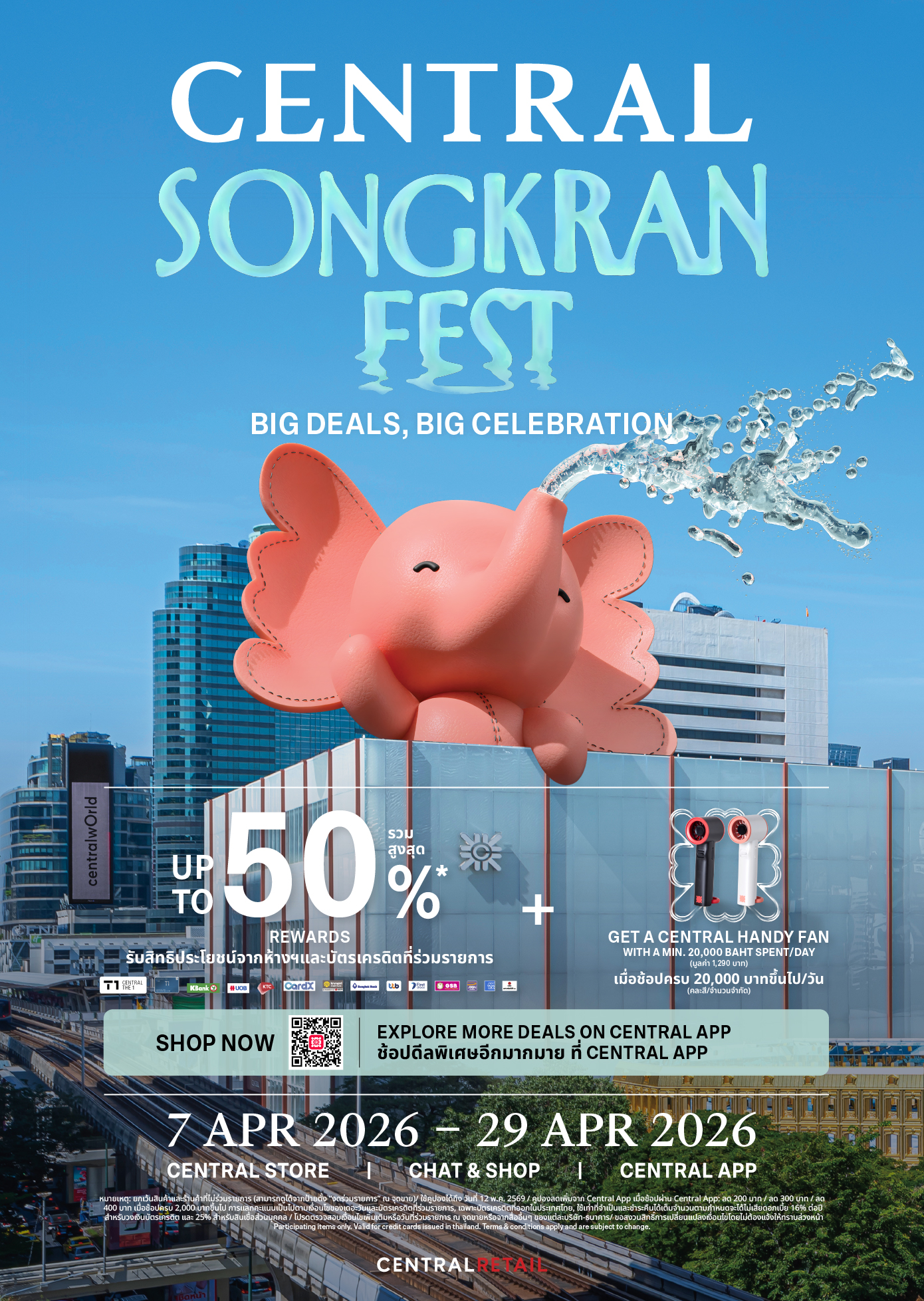 เติมเต็มความสนุกด้วยความอร่อย ความสดชื่นพร้อมบรรยากาศสนุกที่ Eathai ชั้น LG เสริมสิริมงคลด้วย กิจกรรม สรงน้ำพระ วันที่ 10 – 15 เมษายน 2569 เติมเต็มความสนุกโดย Live DJ TukTuk Radio วันที่ 12 – 13 เมษายน 2569 เวลา 12.00 – 14.00 น. และ 17.00 - 19.00 น. สดชื่นรับหน้าร้อนกับ Summer Flavours เสิร์ฟเมนูไทยคลายร้อนสุดพิเศษ อย่างแตงโมหน้าปลาแห้ง ข้าวเหนียวมะม่วง และมะยงชิดลอยแก้ว ตลอดเดือน และพลาดไม่ได้กับความอร่อยสุดเอ็กซ์คลูซีฟ เพียงสั่งอาหารและเครื่องดื่มครบ 400 บาทต่อใบเสร็จ รับฟรี! “ขนมชั้นลายผ้าไทย” ที่สะท้อนเอกลักษณ์วัฒนธรรมไทย (จำนวนจำกัด 60 สิทธิ์) วันที่ 12 – 14 เมษายน 2569