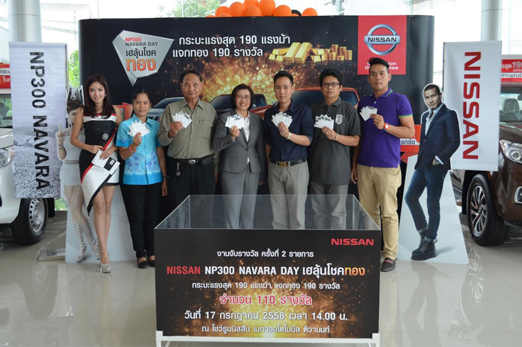 สำหรับลูกค้า นิสสัน เอ็นพี 300 นาวารา ที่โชคดีได้รับรางวัลที่ 1 “ทองคำหนัก 10 บาท” จำนวน 10 รางวัล จากกิจกรรม “Nissan NP300 Navara Day เฮลุ้นโชคทอง กระบะแรงสุด 190 แรงม้า แจกทอง 190 รางวัล”ได้แก่ บริษัท ข้าวดี มีพร้อม จำกัด ฉะเชิงเทรา คุณบาญเย็น สงวนทรัพย์ จ.เชียงราย, คุณสมศักดิ์ อินแสง จ.เชียงราย, คุณไฉไล มามงคล จ.เชียงราย, คุณประจันทร์ อินทนิน จ.จันทบุรี, คุณอรุชา พรมแดง จ.ชลบุรี, คุณสุรพันธ์ บุญพูเลิศ จ.สิงห์บุรี, คุณเสฎฐวุฒิ บวบทอง จ.สุพรรณบุรี, คุณสุรชาติ ธูปเทียน กรุงเทพ และคุณเฮง แซ่อู๋ กรุงเทพ ทั้งนี้นิสสันได้ประกาศรายชื่อลูกค้าผู้โชคดีทั้ง 190 รางวัล เรียบร้อยแล้ว ทาง www.nissan.co.th