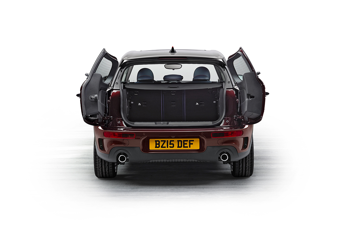 ฝากระโปรงท้ายแบบบานพับสองข้างใช้วัสดุโลหะที่โดดเด่นสะดุดตาเป็นอีกจุดเด่นชวนมองในส่วนท้ายของ มินิ คลับแมน โฉมใหม่ เสากลางระหว่างบานกระจกซ้าย-ขวามีขนาดเล็กลงกว่าในรุ่นก่อนหน้า ซึ่งช่วยเพิ่มวิสัยทัศน์ในการมองด้านหลังให้ดียิ่งขึ้น การเปิดฝากระโปรงท้ายสามารถทำได้ด้วยการใช้มือเปิดจากปุ่มที่มือจับฝากระโปรงทั้งสองข้างซึ่งทำจากวัสดุชุบโครเมียม หรือสามารถเปิดได้โดยไม่ต้องสัมผัสตัวรถด้วยการใช้เท้าไปจ่อที่บริเวณใต้กันชนท้าย ฝากระโปรงท้ายก็จะเปิดโดยอัตโนมัติทีละข้าง ซึ่งฟีเจอร์นี้สามารถใช้งานได้เมื่อผู้ขับมีกุญแจรถอยู่กับตัว