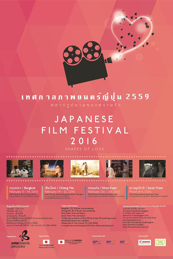สำหรับ“เทศกาลภาพยนตร์ญี่ปุ่น 2559 (JAPANESE FILM FESTIVAL 2016)”ในปีนี้จัดขึ้นเพื่อเป็นการต้อนรับเทศกาลแห่งความรัก จึงได้มาในแนวคิด “Shapes of Love” หลากรูปนามของความรัก บางครั้งก็เจ็บปวด บางครั้งก็รุนแรง บางครั้งก็อบอุ่น การเลือกสิ่งที่ทำให้หัวใจสั่นไหวด้วยวิธีที่ดำรงอยู่ในความรักที่หลากหลายรูปแบบของเหล่าตัวละครในแต่ละเรื่อง โดยคัดสรรภาพยนตร์ญี่ปุ่นคุณภาพเยี่ยมทั้งสิ้น 9 เรื่อง มาให้เลือกชมกันอย่างเต็มอิ่ม