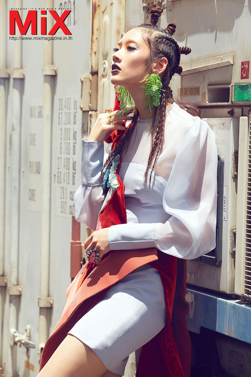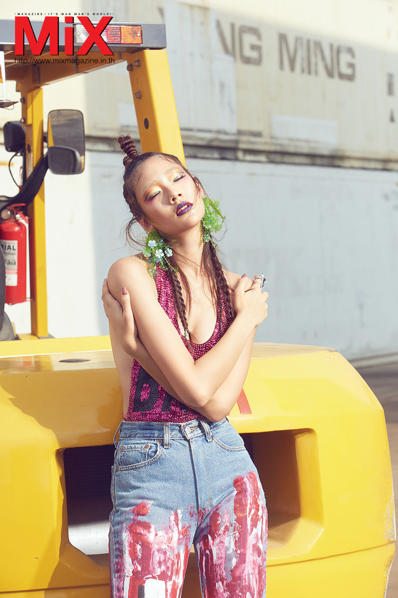 ก่อนอื่นคือดีใจมากค่ะ ที่ MiX เชิญมาเป็นปก เพราะเคยร่วมงานในเซ็ต Glamour ครั้งนั้นทำงานมีความสุขมาก ทีมงานทุกคนเป็นกันเอง จนมาครั้งนี้ก็ยังตื่นเต้นค่ะ ยิ่งได้มาอยู่ในบรรยากาศกองถ่าย เราก็ยิ่งบิ้วตัวเอง แต่สนุกมากกว่าเดิมเพราะได้ทำอะไรหลายอย่าง ทั้งขึ้นเครน ปีนขึ้นตู้คอนเทนเนอร์ แต่งหน้าสีสันจัดจ้าน คือตอบโจทย์ของแฟชั่นเซ็ตนี้จริง ๆ ค่ะ ซึ่งก็คือ Street Pop คำว่า Street ส่วนหนึ่งมาจากตัวของออกแบบเองด้วยที่คนทั่วไปจะมองว่า ลุคเราดูเท่ มีความเป็น Street สูง บวกด้วยโลเคชั่น และความป็อปเองก็ออกมาจากตัวเสื้อผ้า ที่สีสันสดใส การแต่งหน้า ทำผม ทำให้ดูสอดคล้องกันไปหมดค่ะ
