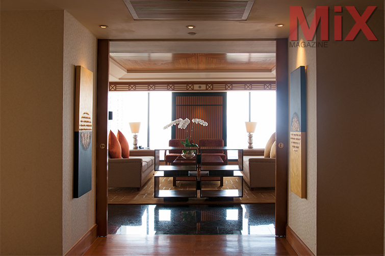ในส่วนของห้องรับแขก ก็ได้รับการดีไซน์ที่สวยหรู เหมาะสำหรับนั่งพบปะพูดคุย หรือเป็นมุมพักผ่อนก็ยังได้ นอกจากนี้แล้วยังมีส่วนของโต๊ะทำงาน พื้นที่รับประทานอาหารเครื่องชงชากาแฟ มินิบาร์ รวมถึงบริการรูมเซอร์วิส 24 ตลอดชั่วโมง
