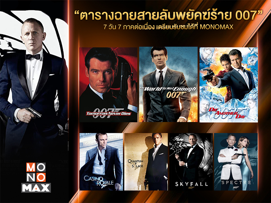 “MONOMAX” (โมโนแมกซ์) ผู้นำดูหนังออนไลน์แบบถูกลิขสิทธิ์ ในเครือ โมโน เน็กซ์ จัดเต็มความมันส์ 7 วันรวด!!! ด้วยการนำเสนอภาพยนตร์แฟรนไชส์สุดยอดสายลับระดับโลก "เจมส์ บอนด์ 007" มาให้รับชมกันยาวๆ 7 วัน 7 ภาคติดต่อกัน! เริ่มตั้งแต่วันที่ 20-26 ตุลาคมนี้ เวลา 18.00 น. เป็นต้นไป! งานนี้สาวก “เจมส์ บอนด์” เคลียร์คิวให้ว่างแล้วรอรับชมผ่านทาง MONOMAX (โมโนแมกซ์) โดยสามารถรับชมพร้อมกันได้ถึง 4 อุปกรณ์ พิเศษ!!! ลดสุดปัง!!! ส่งท้ายปี จ่ายเพียงแค่ 129 บาท ดูไม่อั้นนาน 2 เดือน ตั้งแต่วันนี้ – 31 ธันวาคม 2563 เมื่อสมัครผ่าน www.monomax.me โทรสอบถามที่ 02-100-7007 หากใครพลาด 7 วันนี้ สามารถรับชมย้อนหลังทั้ง 7 ภาคต่อเนื่องได้ตลอด!!