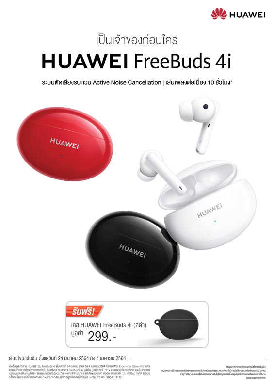 HUAWEI FreeBuds 4i วางจำหน่ายในประเทศไทยทั้งหมด 3 สี ได้แก่ Ceramic White, Carbon Black และ Red Edition มาในราคาสุดคุ้มที่ใครก็เป็นเจ้าของได้ง่ายๆ เพียง 2,799 บาท แถมยังมาพร้อมความพิเศษสุดสำหรับผู้ที่ซื้อ HUAWEI FreeBuds 4i ตั้งแต่วันที่ 24 มีนาคม - 4 เมษายน 2564 รับทันที HUAWEI FreeBuds 4i CASE สีดำ มูลค่า 299 บาท เมื่อซื้อสินค้าที่หน้าร้าน HUAWEI Experience Store และร้านค้าตัวแทนจำหน่ายที่ร่วมรายการ รวมถึงช่องทางออนไลน์อย่าง HUAWEI Online Store, Shopee, Lazada และ JD Central หรือสามารถตามไปอ่านรายละเอียดเกี่ยวกับผลิตภัณฑ์เพิ่มเติมได้ที่นี่