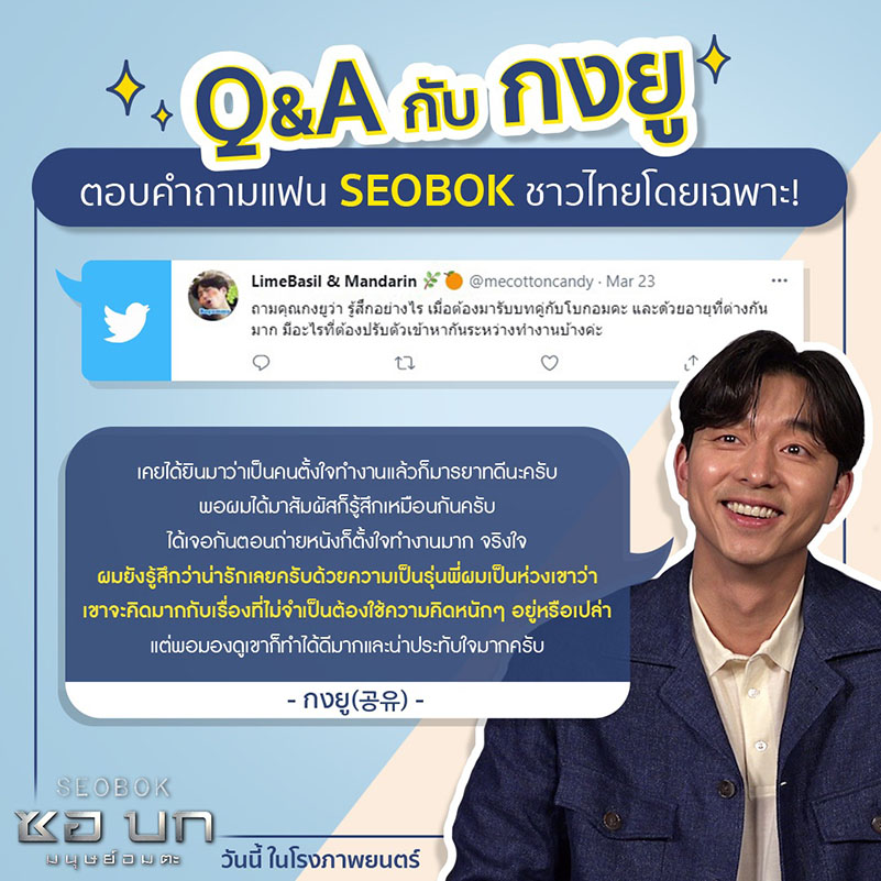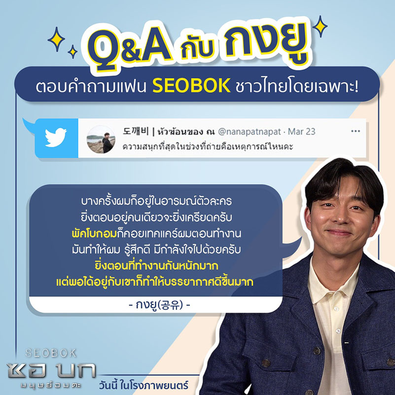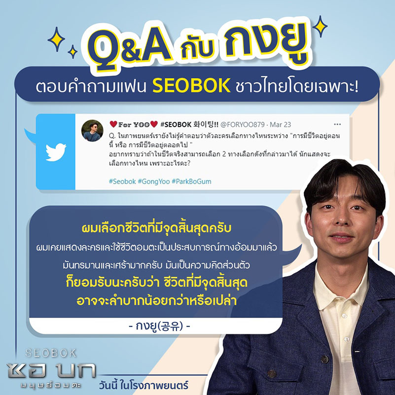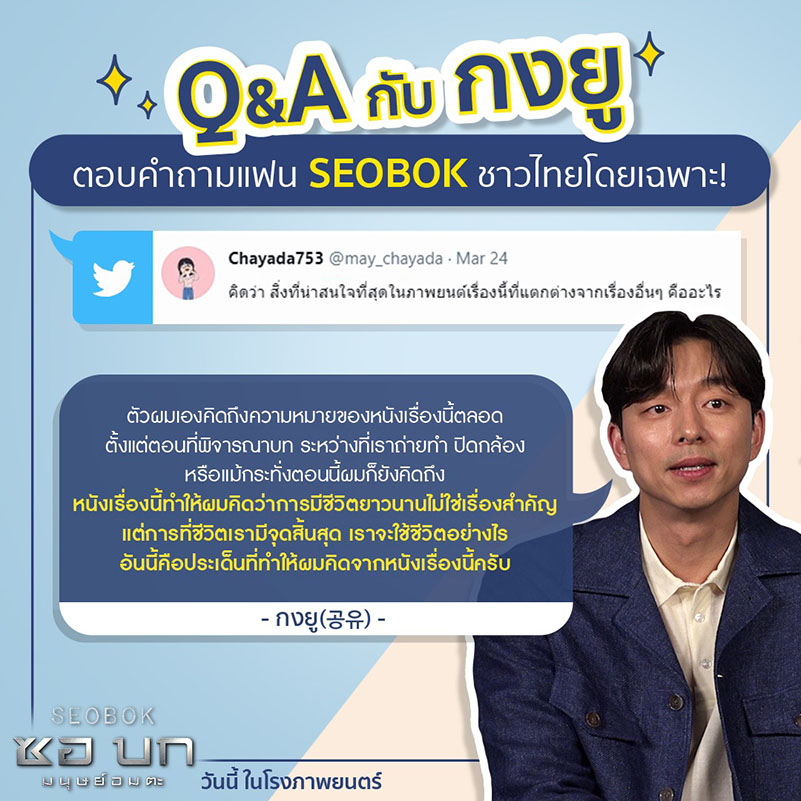 นี่เป็นเพียงเสี้ยวหนึ่งของความพิเศษที่ SEOBOK จัดให้แฟนชาวไทยเท่านั้น เพราะยังมีความน่ารัก และความทุ่มเทในการทำงานของพวกเขาที่อัดแน่นมาเสิร์ฟให้แฟนคลับกันแบบเต็มคลิป แล้วอย่างลืมเข้าไปให้กำลังใจ กงยู และ พัคโบกอม กับปรากฏการณ์ภาพยนตร์อันดับหนึ่งของวันนี้ กับ SEOBOK ซอ-บก มนุษย์อมตะ ในโรงภาพยนตร์
