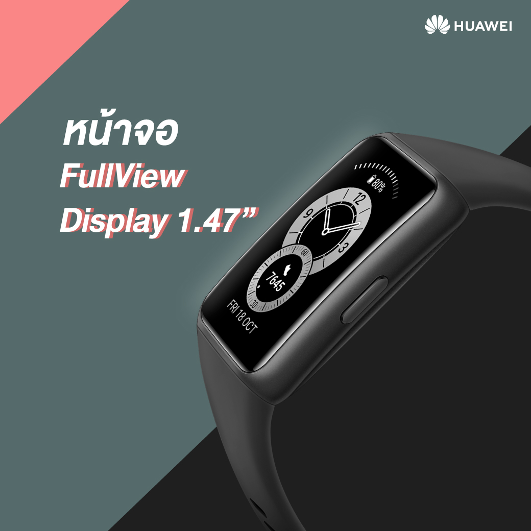 HUAWEI Band 6 มาพร้อมหน้าจอ AMOLED FullView display ขนาด 1.47 นิ้ว ใหญ่ขึ้นถึง 148 เปอร์เซ็นต์เมื่อเทียบกับสมาร์ทแบนด์ทั่วไปที่มีขนาดหน้าจอ 0.95 นิ้ว จึงมีรูปลักษณ์ที่คล้ายคลึงกับสมาร์ทวอทช์ โดยมีระดับความชัดที่ 194x368 พิกเซล และความละเอียด 282 PPI ให้สีสันและรายละเอียดที่คมชัดและเต็มตายิ่งกว่าที่เคย ผู้ใช้งานจึงสามารถควบคุม HUAWEI Band 6 ผ่านระบบสัมผัสหน้าจอได้สะดวกสบายขึ้น ไม่ว่าจะเป็นการปัดขึ้น-ลง หรือซ้าย-ขวา ก็ทำได้อย่างง่ายดายไม่ต่างจากการใช้สมาร์ทวอทช์ พร้อมด้วย Watch Faces ที่มีหลากหลายสไตล์ให้ผู้ใช้งานเลือกได้ตามใจชอบ โดยหัวเว่ยยังได้ผนึกพลังกับทีมดีไซน์เนอร์ชาวไทยในการออกแบบลวดลายหน้าปัดที่สะท้อนอัตลักษณ์ความเป็นไทยอีกด้วย