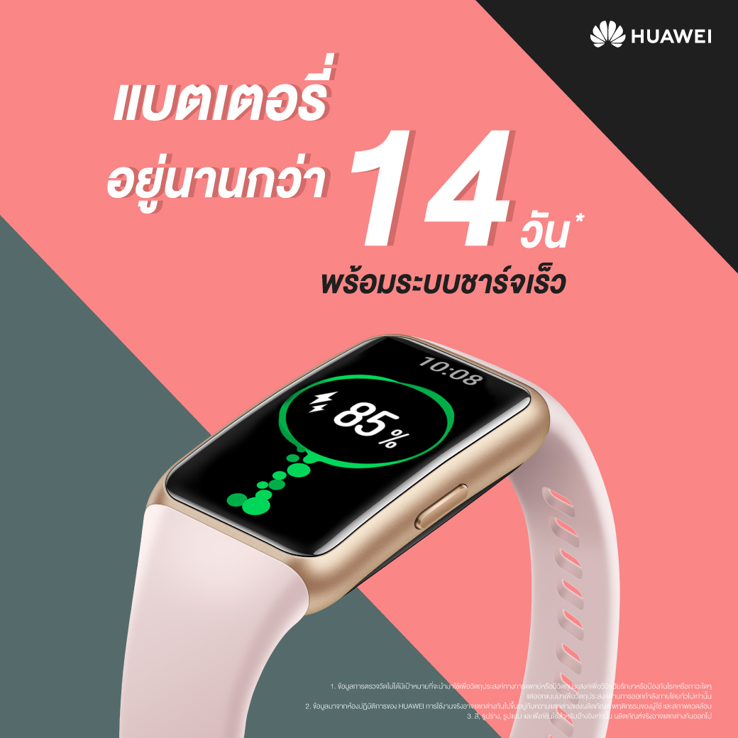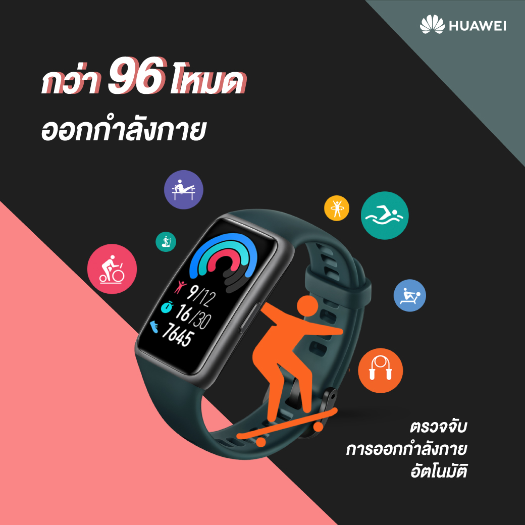 ผสานขุมกำลังของสุดยอดเทคโนโลยีอันล้ำสมัยอย่าง HUAWEI TruSeenTM 4.0 และอัลกอริธึมเพื่อการประหยัดพลังงานแบบใหม่ ทำให้สามารถวัดค่าความอิ่มตัวของออกซิเจนในเลือด1 หรือค่า SpO2 ระหว่างออกกำลังกายได้ ทั้งยังวัดอัตราการเต้นของหัวใจขณะออกกำลังกายได้เป็นอย่างดี โดยมอบโหมดออกกำลังกายให้อย่างจุใจถึง 96 โหมด ซึ่งรวมไปถึงโหมดใหม่ๆ ที่กำลังได้รับความนิยม อาทิ สเก็ตบอร์ด และกระโดดเชือก พร้อมรองรับทุกไลฟ์สไตล์ของสายแอคทีฟอย่างครอบคลุม และยังก้าวล้ำขึ้นไปอีกขั้นกับฟังก์ชันพิเศษซึ่งจะช่วยวัดรอบประจำเดือนและเตือนคุณสุภาพสตรีเมื่อรอบเดือนมาถึง เรียกได้ว่าตอบโจทย์ผู้ใช้งานทุกเพศทุกวัยอย่างแท้จริง