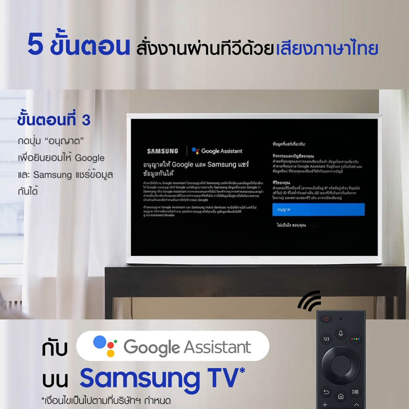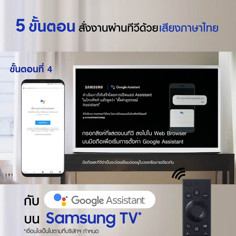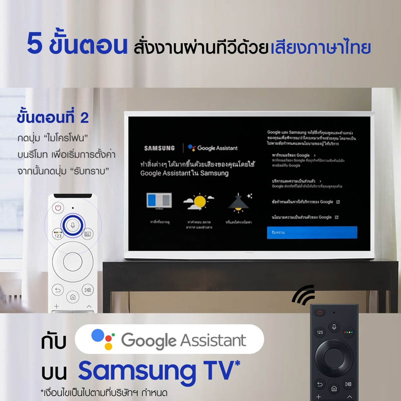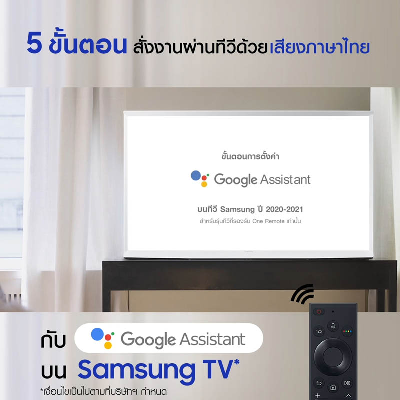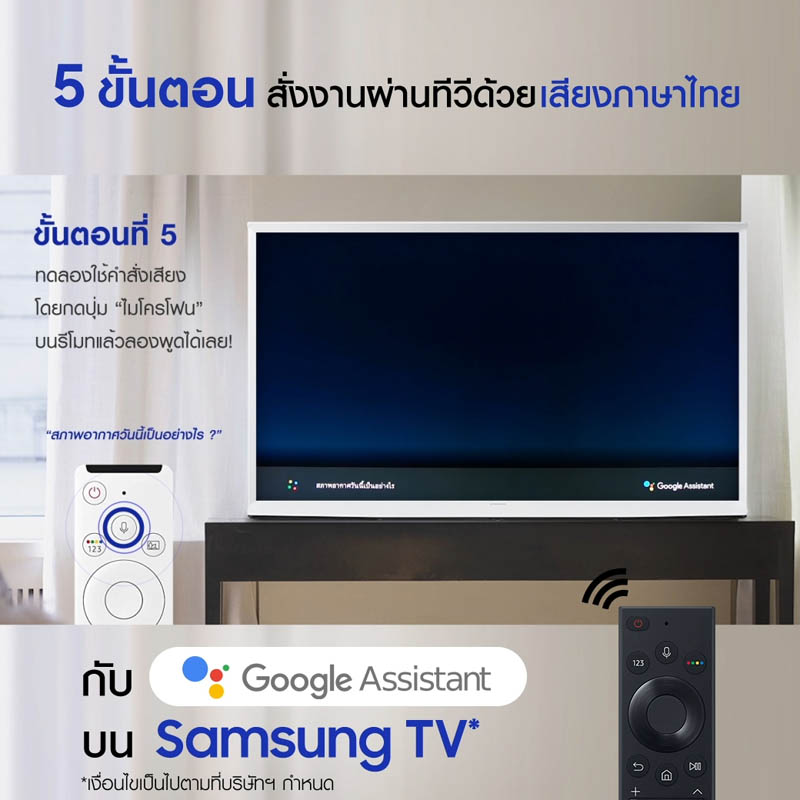 ศึกษาวิธีการตั้งค่า Google Assistant บนซัมซุงทีวี ได้ที่ https://www.youtube.com/watch?v=llYbPubBbLI หรือ https://www.samsung.com/th/support/tv-audio-video/use-google-assistant-on-your-2020-samsung-tv/ ผู้ที่สนใจผลิตภัณฑ์ทีวีของซัมซุง สามารถค้นหาข้อมูลได้ที่ https://www.samsung.com/th/tvs/