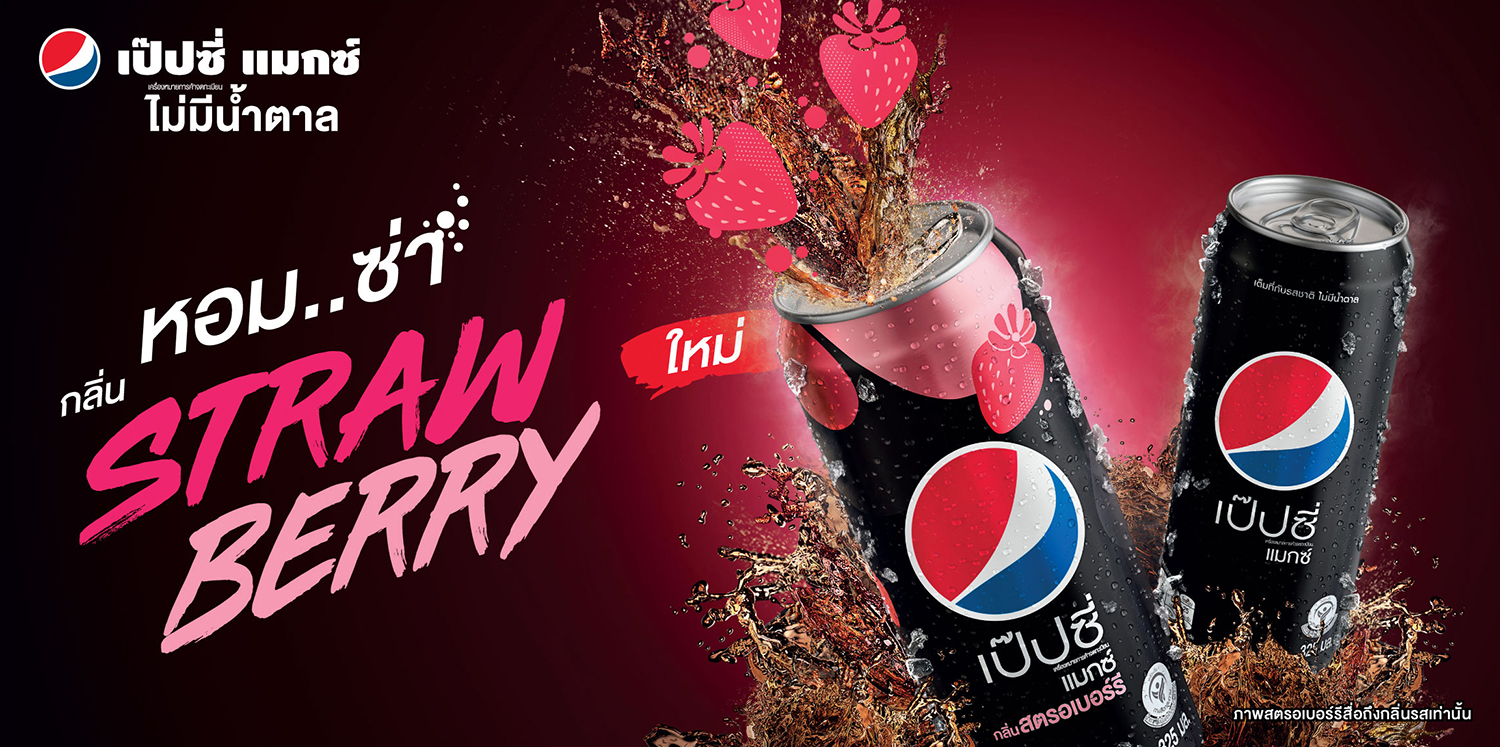 บริษัท ซันโทรี่ เป๊ปซี่โค เบเวอเรจ (ประเทศไทย) จำกัด ผู้ผลิตและจัดจำหน่ายเครื่องดื่มภายใต้แบรนด์สินค้าของซันโทรี่และเป๊ปซี่โคในประเทศไทย ส่งตรงผลิตภัณฑ์ใหม่ล่าสุดในประเทศไทย เอาใจลูกค้ากลุ่มเป้าหมายที่กังวลเรื่องน้ำตาลและแคลอรี ด้วย เป๊ปซี่แมกซ์ กลิ่นสตรอเบอร์รี ครั้งแรกกับที่สุดของการผสานกันอย่างลงตัวของเครื่องดื่มน้ำอัดลมที่อร่อยซ่าเต็มที่ แบบไม่มีน้ำตาล 0 แคลอรี และกลิ่นหอมอันเป็นเอกลักษณ์ของสตรอเบอร์รีที่คุณชื่นชอบ จนได้เป็นรสชาติใหม่ที่หอมซ่าแตกต่างจนใครก็อยากลอง มีให้เลือกทั้งแบบกระป๋อง ขนาด 325 มิลลิลิตร และแบบขวด ขนาด 345 มิลลิลิตร 550 มิลลิลิตร และ 1 ลิตร ทยอยวางจำหน่ายแล้วในร้านสะดวกซื้อ ร้านค้าปลีก-ส่ง ซูเปอร์มาร์เก็ต และห้างสรรพสินค้าชั้นนำทั่วประเทศ